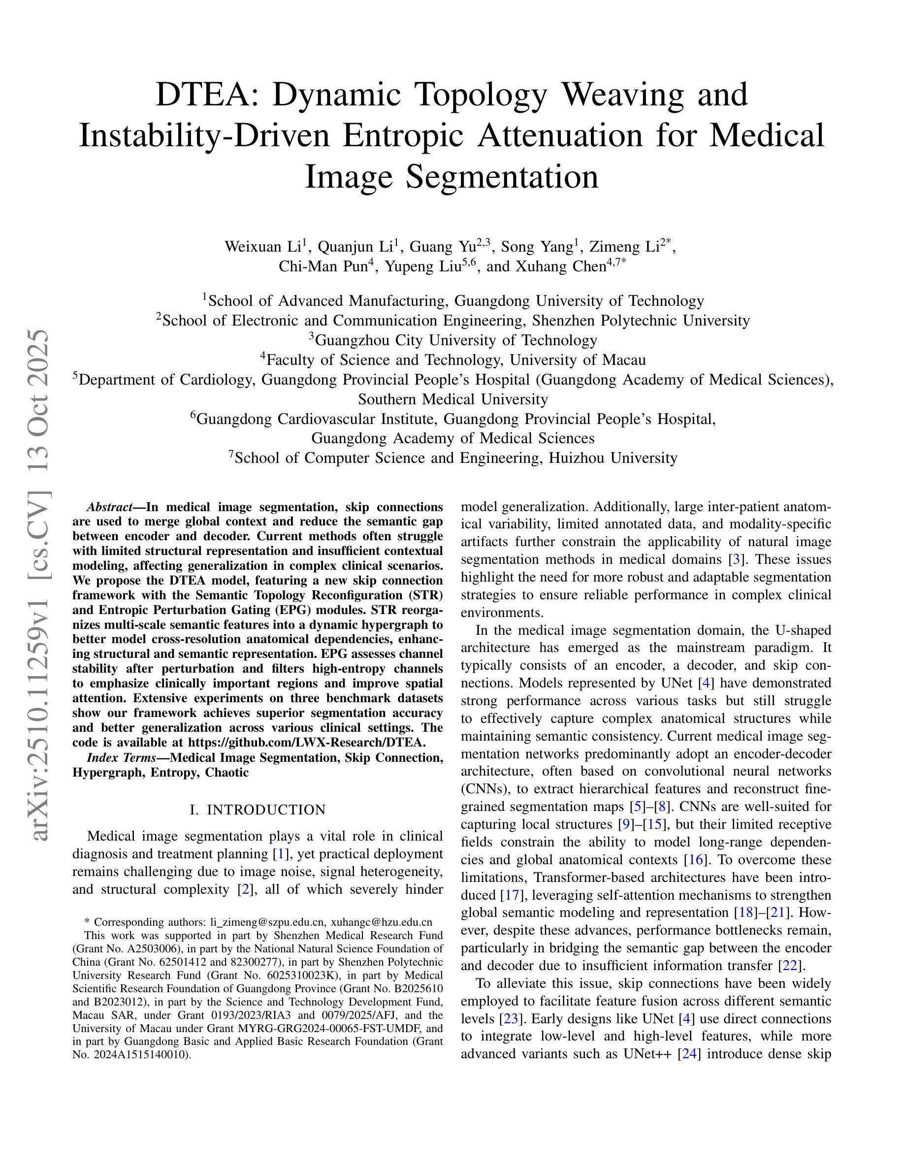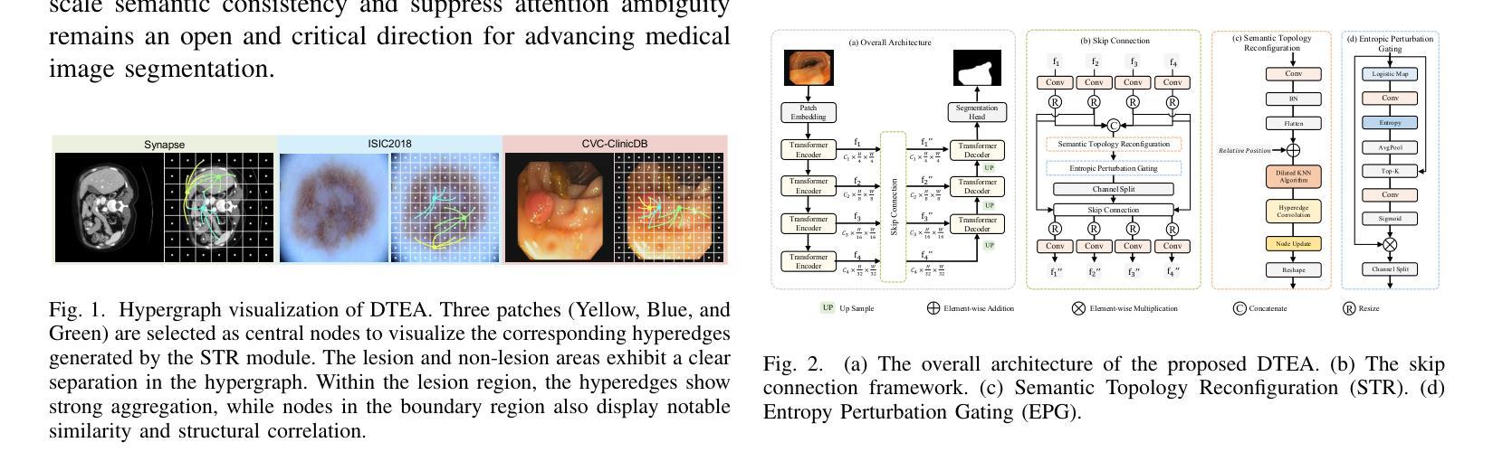 医学图像分割中,使用跳连接合并全局上下文信息,缩小编码器和解码器之间的语义鸿沟。当前方法存在结构表征有限和上下文建模不足的问题,影响在复杂临床场景中的泛化能力。提出DTEA模型,采用带有语义拓扑重构(STR)和熵扰动门控(EPG)模块的新跳连接框架。STR将多尺度语义特征重构为动态超图,以更好地建模跨分辨率解剖依赖性,增强结构和语义表征。EPG评估扰动后的通道稳定性,过滤高熵通道以突出临床重要区域,提高空间注意力。在三个基准数据集上的广泛实验表明,该框架实现了更高的分割精度,并在各种临床环境中具有更好的泛化能力。
