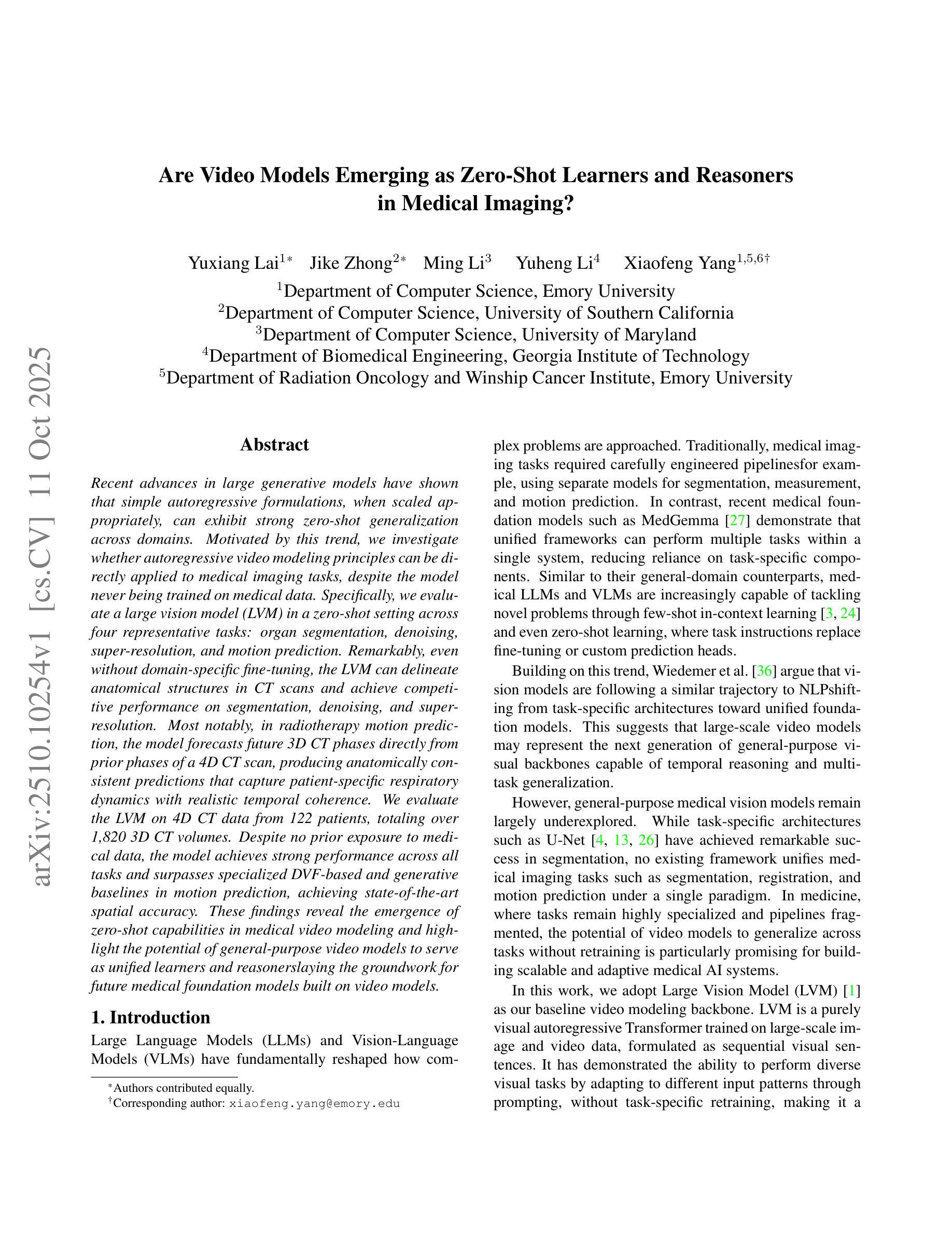 本文探讨了大型生成模型在医学视频建模中的应用。研究发现在零样本场景下,即使未经过医学数据训练,基于自动回归原理的大型视觉模型(LVM)也能在医学成像任务中表现出强大的泛化能力。在器官分割、去噪、超分辨率和动态预测等四个任务中,LVM展现了竞争性能,特别是在放疗动态预测中,该模型可直接从4D CT扫描的先前阶段预测未来的3D CT阶段,产生解剖结构一致、捕捉患者特定呼吸动态的预测结果。这些发现揭示了零样本能力在医学视频建模中的涌现,突显了通用视频模型作为统一学习者和推理者的潜力,为未来的医学基础模型提供了参考。