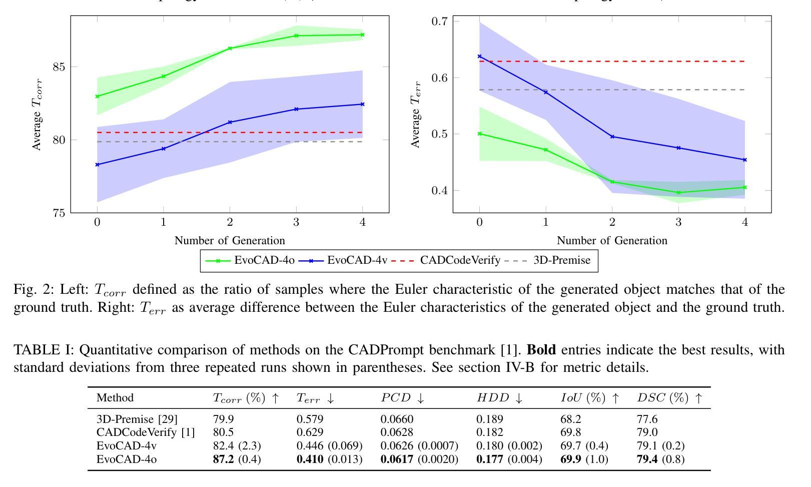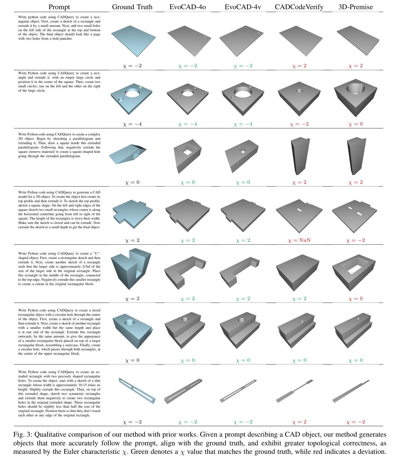 - EvoCAD在多个指标上优于先前方法,尤其在生成拓扑正确的对象方面表现突出。