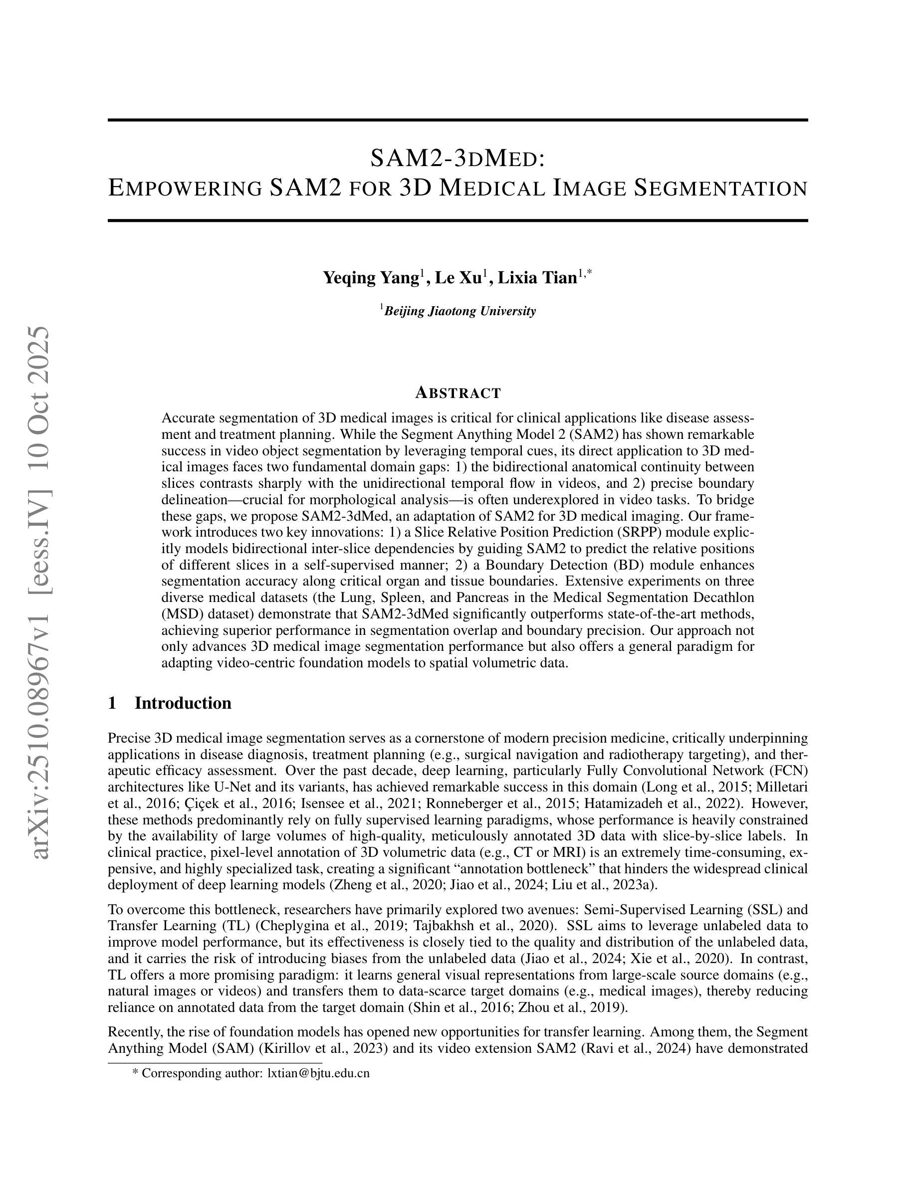 在疾病评估和制定治疗方案等临床应用中,对三维医学图像进行精确分割至关重要。虽然Segment Anything Model 2(SAM2)通过利用时序线索在视频对象分割方面取得了显著的成功,但将其直接应用于三维医学图像面临两个基本的领域差距:一是切片之间的双向解剖连续性与视频中的单向时间流存在明显对比;二是精确的边缘界定对于形态分析至关重要,在视频任务中经常被忽视。为了弥补这些差距,我们提出了SAM2-3dMed,这是一个针对三维医学成像的SAM2的改进框架。我们的框架引入了两个关键的创新点:一是切片相对位置预测(SRPP)模块通过指导SAM2以自我监督的方式预测不同切片的相对位置,显式地建立切片间的双向依赖关系;二是边界检测(BD)模块可提高重要器官和组织边界处的分割精度。在医学分割全能挑战赛(MSD)数据集的三部分数据集(肺部、脾脏和胰腺)上进行的广泛实验表明,SAM2-3dMed在分割重叠和边界精度方面均显著优于最先进的方法。我们的方法不仅提高了三维医学图像分割的性能,还为将视频中心基础模型适应于空间体积数据提供了一个通用的范式。