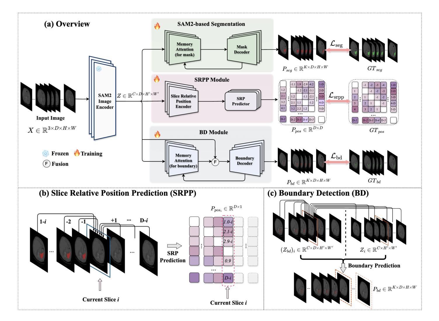 - SAM2-3dMed引入了两个关键模块:Slice Relative Position Prediction(SRPP)模块和Boundary Detection(BD)模块。SRPP模块通过预测不同切片之间的相对位置来模拟双向切片间依赖性;BD模块提高了关键器官和组织的边界分割精度。