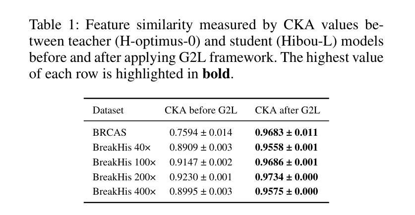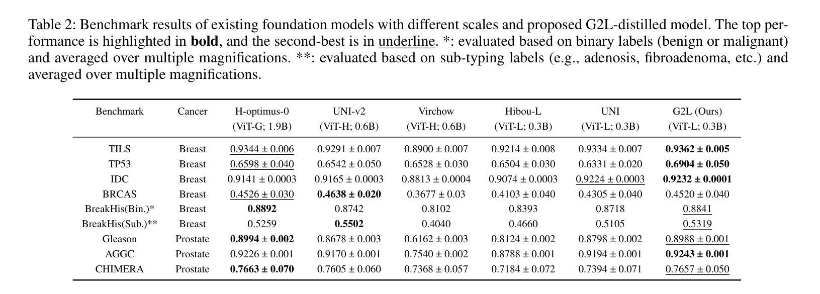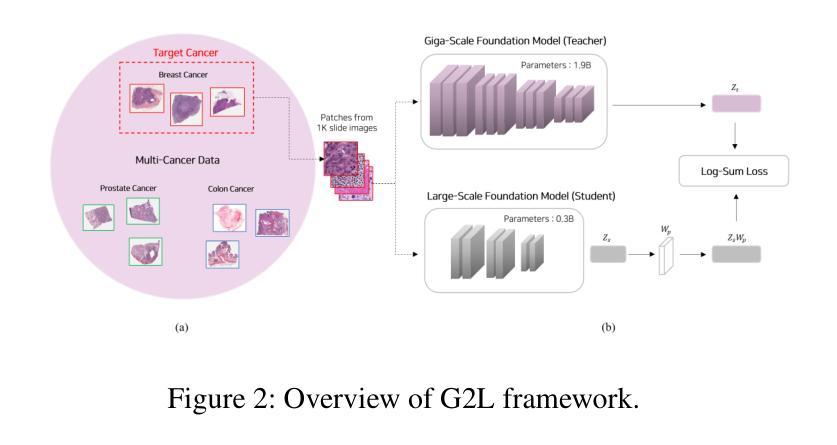 - 提出G2L框架,通过知识蒸馏技术,仅使用1K目标癌症病理切片,提高大规模模型的性能。