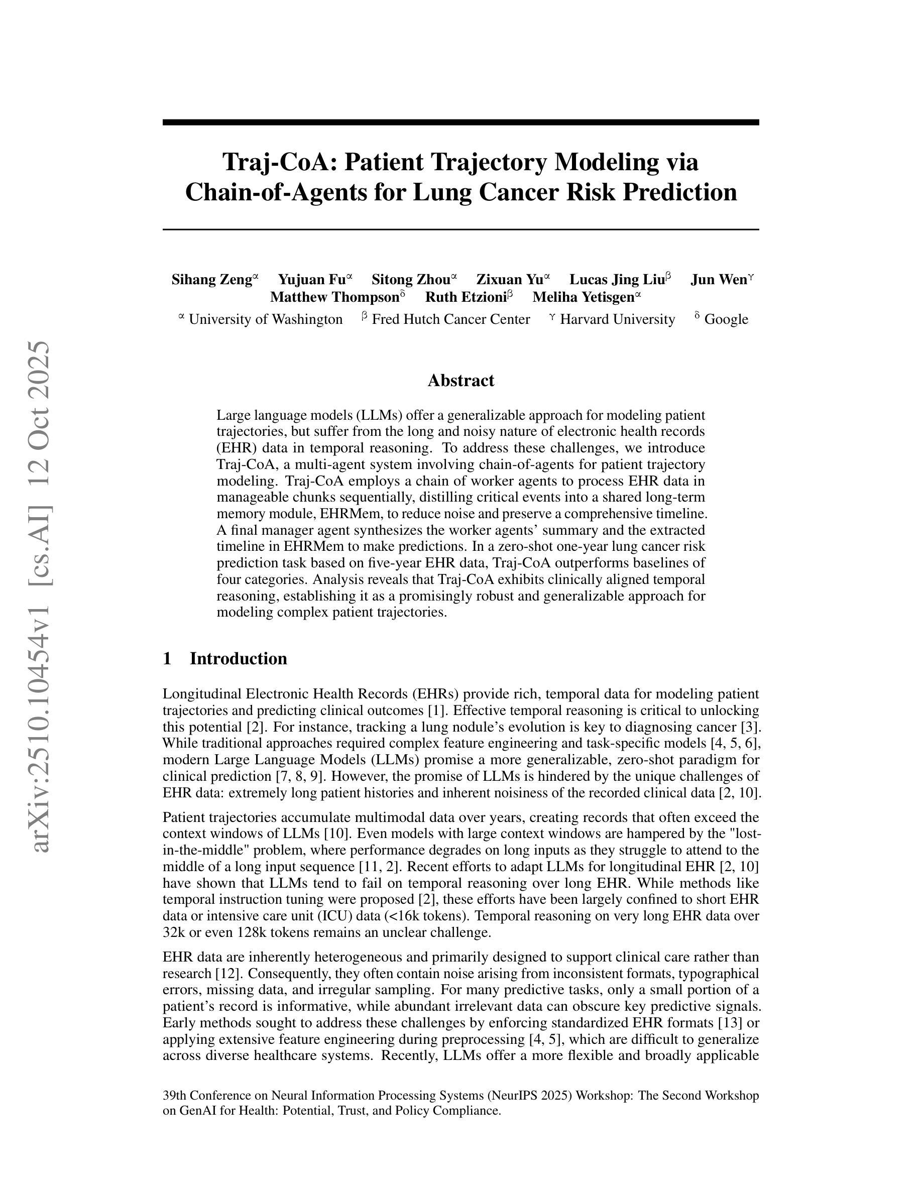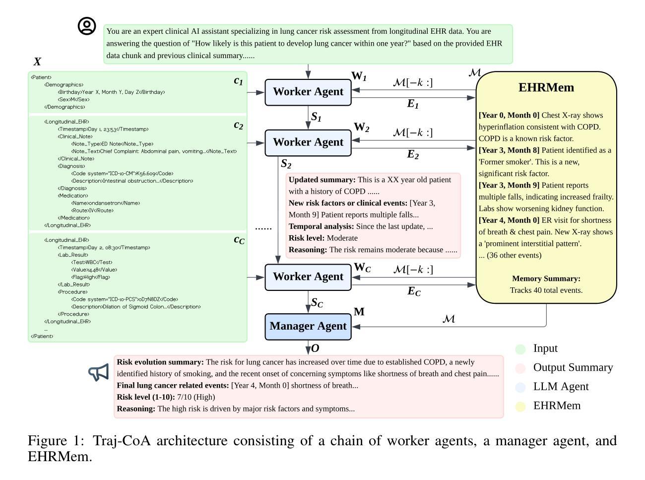 基于大型语言模型(LLMs)在患者轨迹建模中的通用性和电子健康记录(EHR)数据在时序推理中的长噪问题,我们引入了Traj-CoA多智能体系统,该系统通过一系列工作智能体处理EHR数据,将关键事件蒸馏到共享的长期内存模块EHRMem中,以减小噪声并保留全面的时间线。最终管理者智能体结合了工作智能体的摘要和EHRMem中提取的时间线进行预测。在基于五年EHR数据的零样本一年肺癌风险预测任务中,Traj-CoA优于四类基线方法,展现出良好的临床一致性时序推理能力。