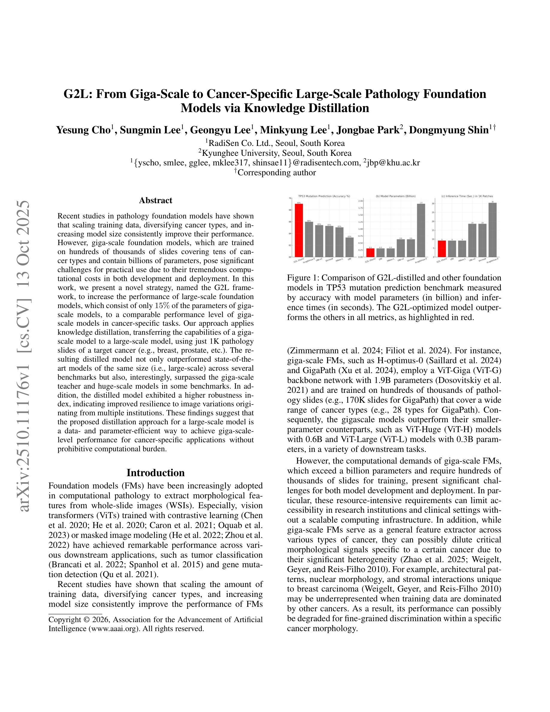 本文提出一种名为G2L框架的新型策略,通过知识蒸馏技术,将大规模基础模型的性能提升到与千兆规模模型相当的水平,且仅使用目标癌症(如乳腺癌、前列腺癌等)的1K病理切片。这种蒸馏模型不仅在多个基准测试中超越了现有大规模模型,还在某些基准测试中超越了原始千兆规模模型,并展现出更高的稳健性指数。