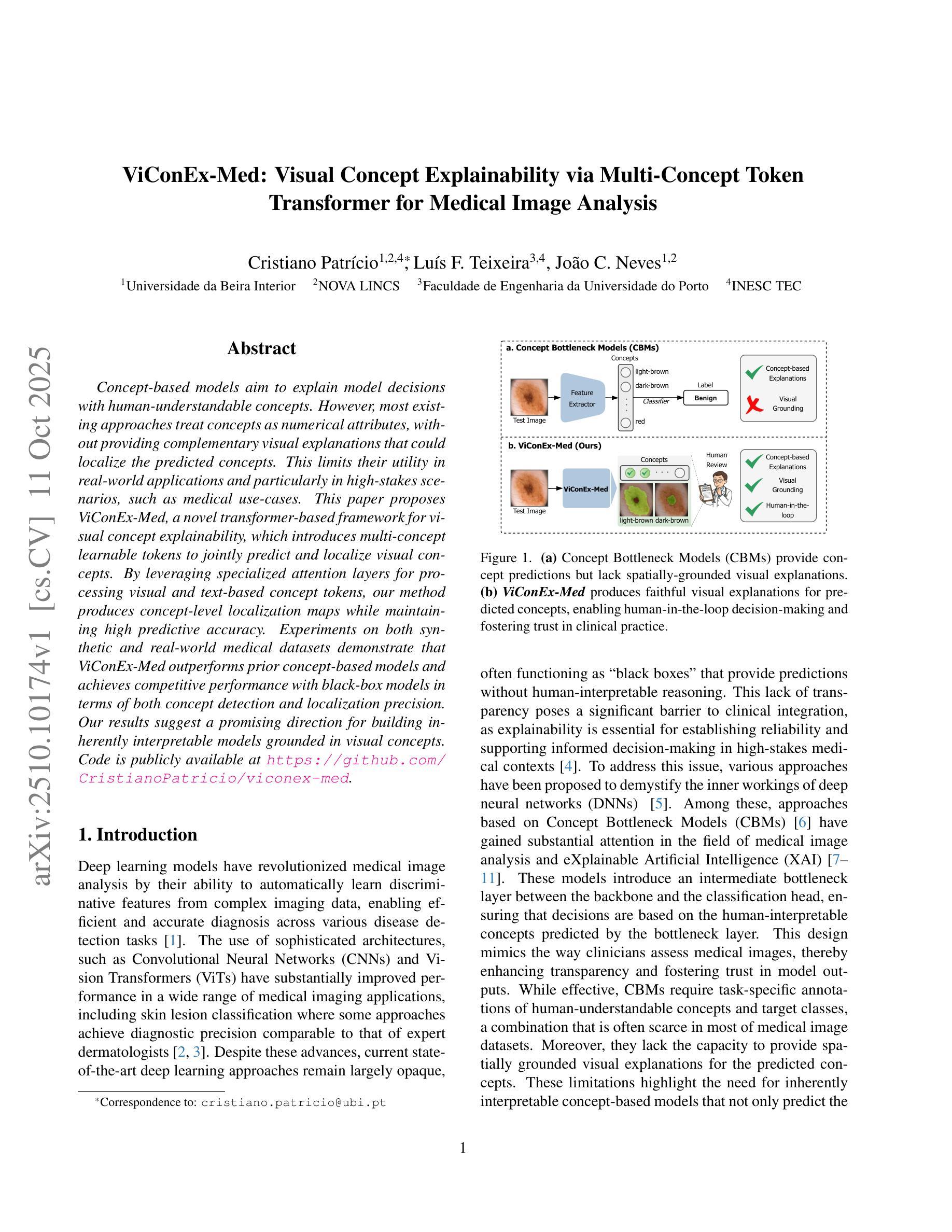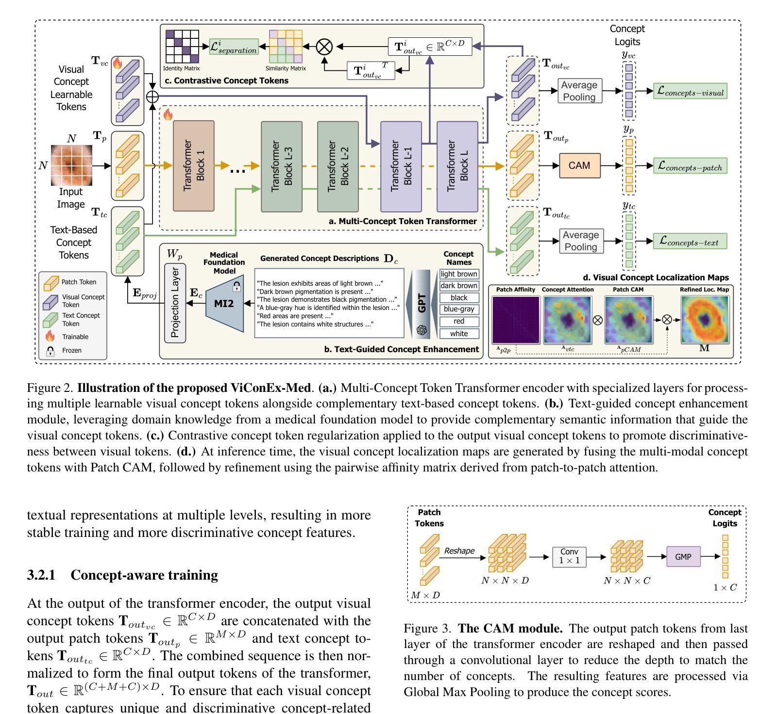 基于概念模型的目的是用人类可理解的概念来解释模型的决策。然而,现有的大多数方法都将概念视为数值属性,而没有提供可以定位预测概念的补充视觉解释。这限制了它们在现实世界应用和高风险场景(如医疗用例)中的实用性。本文提出了ViConEx-Med,这是一种基于transformer的视觉概念可解释性新框架,它引入了多概念可学习令牌来共同预测和定位视觉概念。通过利用用于处理视觉和基于文本的概念令牌的特殊注意力层,我们的方法在保持高预测准确性的同时,生成了概念层面的定位图。在合成和真实世界医疗数据集上的实验表明,ViConEx-Med优于先前的基于概念模型,在概念检测和定位精度方面实现了与黑匣模型相竞争的表现。我们的研究为建立基于视觉概念的内在可解释模型提供了一个有前途的方向。代码可在https://github.com/CristianoPatricio/viconex-med上公开获取。