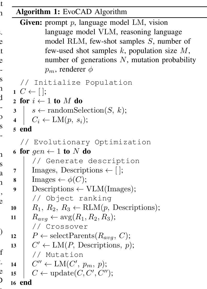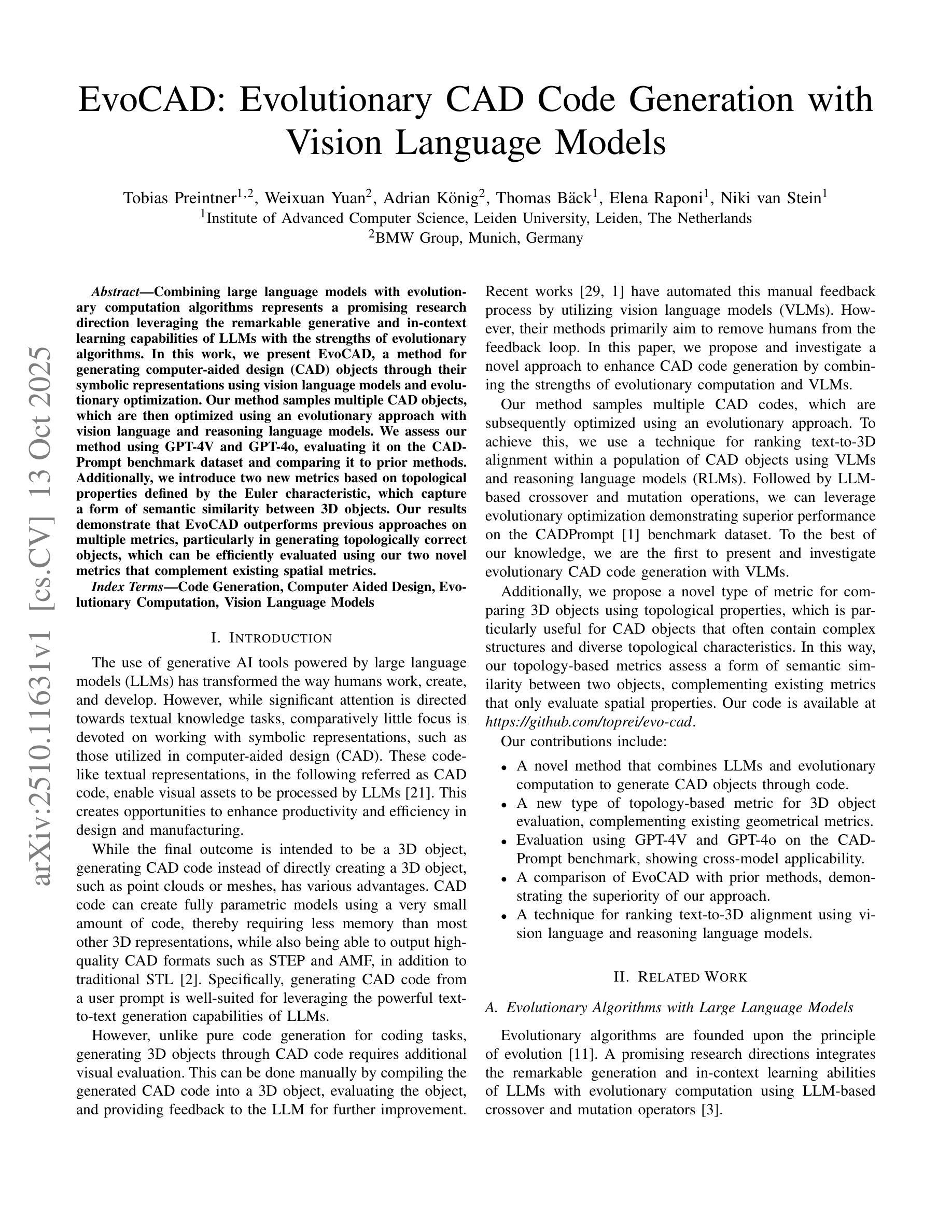 将大型语言模型与进化计算算法相结合,利用语言模型的生成能力和上下文学习能力以及进化算法的优势,是一个充满前景的研究方向。在这项工作中,我们提出了EvoCAD方法,该方法通过视觉语言模型和进化优化生成计算机辅助设计(CAD)对象的符号表示。我们的方法采样多个CAD对象,然后使用带有视觉语言和推理语言模型的进化方法进行优化。我们使用GPT-4V和GPT-4o评估了我们的方法,在CADPrompt基准数据集上对其进行了评估,并将其与先前的方法进行了比较。此外,我们还引入了基于欧拉特征定义的两个新指标,它们能够捕捉三维对象之间的语义相似性。我们的结果表明,在多个指标上,EvoCAD优于先前的方法,特别是在生成拓扑正确的对象方面,这可以通过我们补充现有空间指标的两个新指标进行有效评估。