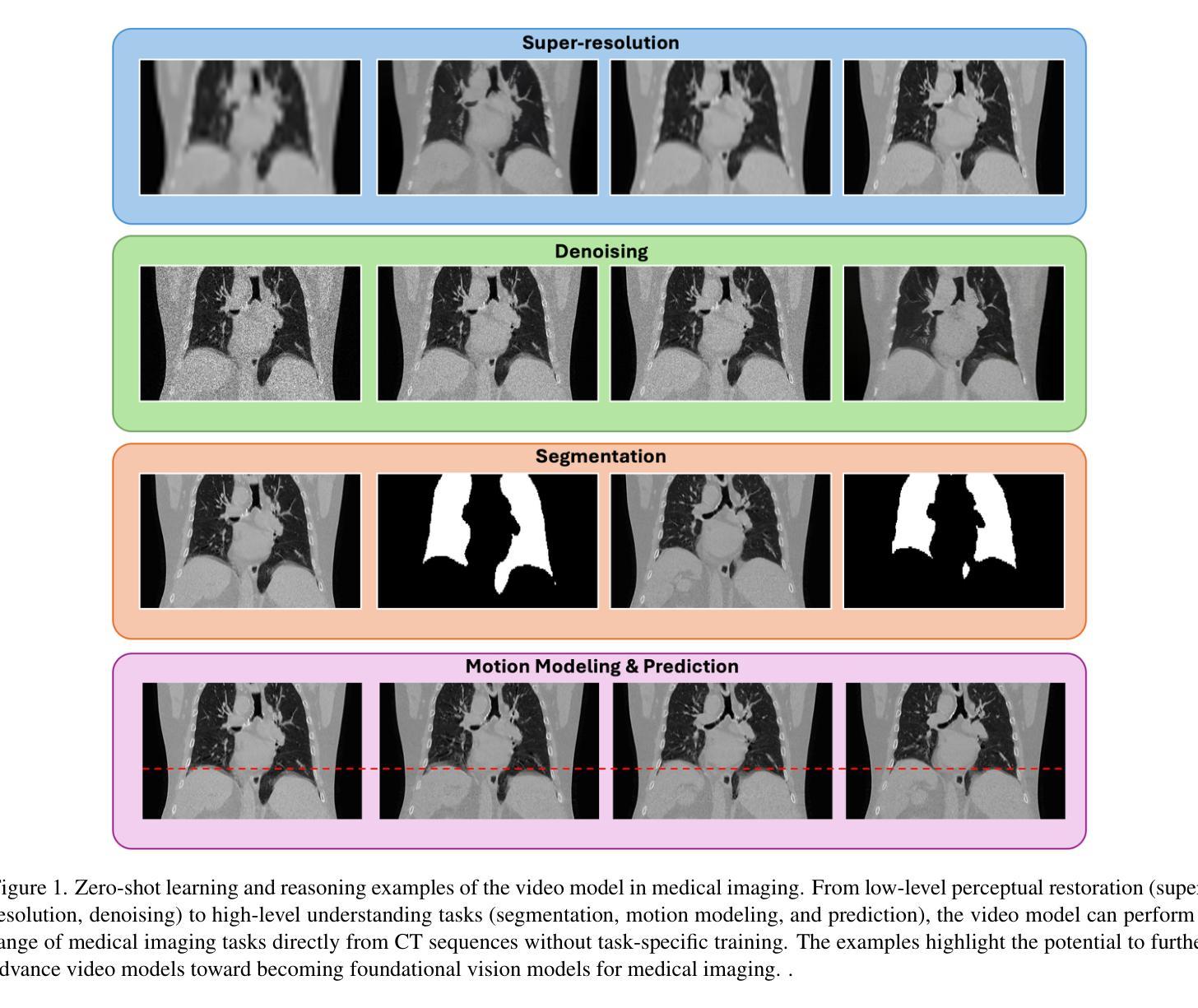 最近的大型生成模型的进展表明,简单的自回归公式,在适当规模上,可以展现出跨领域的零样本泛化能力。受此趋势的推动,我们研究是否可以将自回归视频建模原则直接应用于医学成像任务,尽管该模型从未在医疗数据上进行训练。具体来说,我们在四个代表性任务中评估了一个大型视觉模型(LVM)的零样本设置:器官分割、去噪、超分辨率和运动预测。值得注意的是,即使没有针对特定领域的微调,LVM也能在CT扫描中描绘出解剖结构,并在分割、去噪和超分辨率方面达到颇具竞争力的性能。最值得注意的是,在放疗运动预测中,该模型直接从4D CT扫描的先前阶段预测未来的3D CT阶段,产生解剖结构一致的预测,捕捉患者特定的呼吸动力学,具有现实的时间连贯性。我们在来自122名患者的4D CT数据上评估了LVM,总计超过1820个3D CT体积。尽管该模型之前没有接触过医疗数据,但它在所有任务中都表现出强大的性能,在运动预测方面超越了基于DVF和生成基线,达到了最先进的空间精度。这些发现揭示了医疗视频建模中零样本能力的出现,并突出了通用视频模型作为未来建立在视频模型上的医疗基础模型的统一学习者和推理者的潜力。