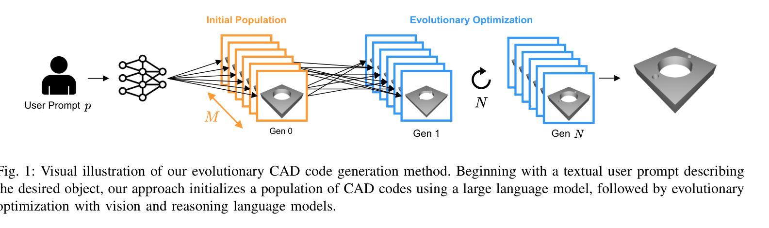 本工作提出一种名为EvoCAD的方法,结合大型语言模型和进化计算算法,通过视觉语言模型和进化优化生成计算机辅助设计(CAD)对象的符号表示。该方法采用进化算法优化采样得到的CAD对象,并在CADPrompt基准数据集上评估其性能,引入基于Euler特征拓扑属性的两个新指标来捕捉三维对象之间的语义相似性。实验结果表明,EvoCAD在多个指标上优于先前的方法,特别是在生成拓扑正确的对象方面。