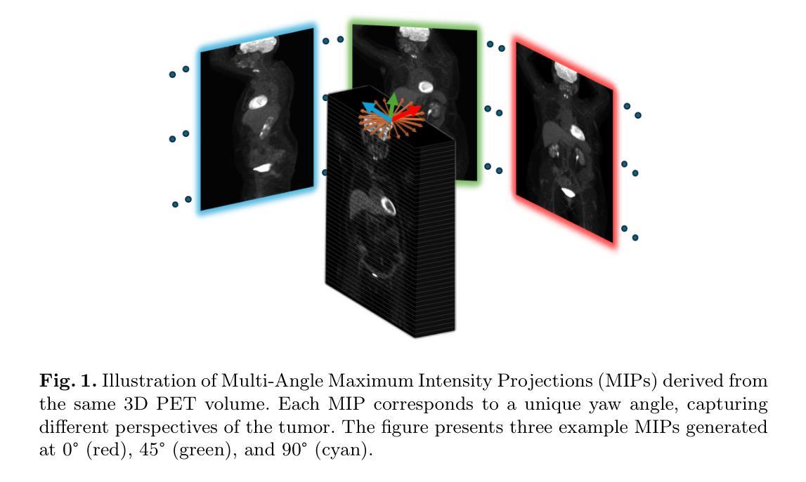 PET/CT成像在肿瘤检测方面是金标准,能准确识别局部和转移性病灶。本文提出一种基于MIP(多角度最大强度投影)的肿瘤分割方法,直接对MIPs进行训练,避免了三维体积的分割和投影需求,提高了计算效率和训练时间。同时,引入了一种新颖的遮挡校正方法,用于恢复被高强度结构遮挡的MIP注释,提高了分割效果。实验结果表明,MIP方法达到与三维技术相当的分割性能,同时降低了训练时间、能耗和计算量。对于分类任务,仅使用16个MIP作为输入,即可超越三维技术的性能。对MIP数量对分割影响的分析表明,48个视角是最佳的,能在性能和效率之间达到最佳平衡。