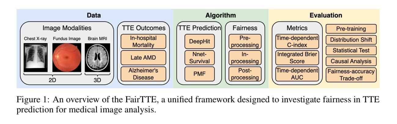 - FairTTE涵盖多种成像方式和时间至事件(TTE)结果,集成先进的TTE预测和公平性算法。