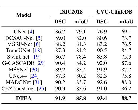 - 在三个基准数据集上的实验表明,DTEA模型实现了较高的分割精度。