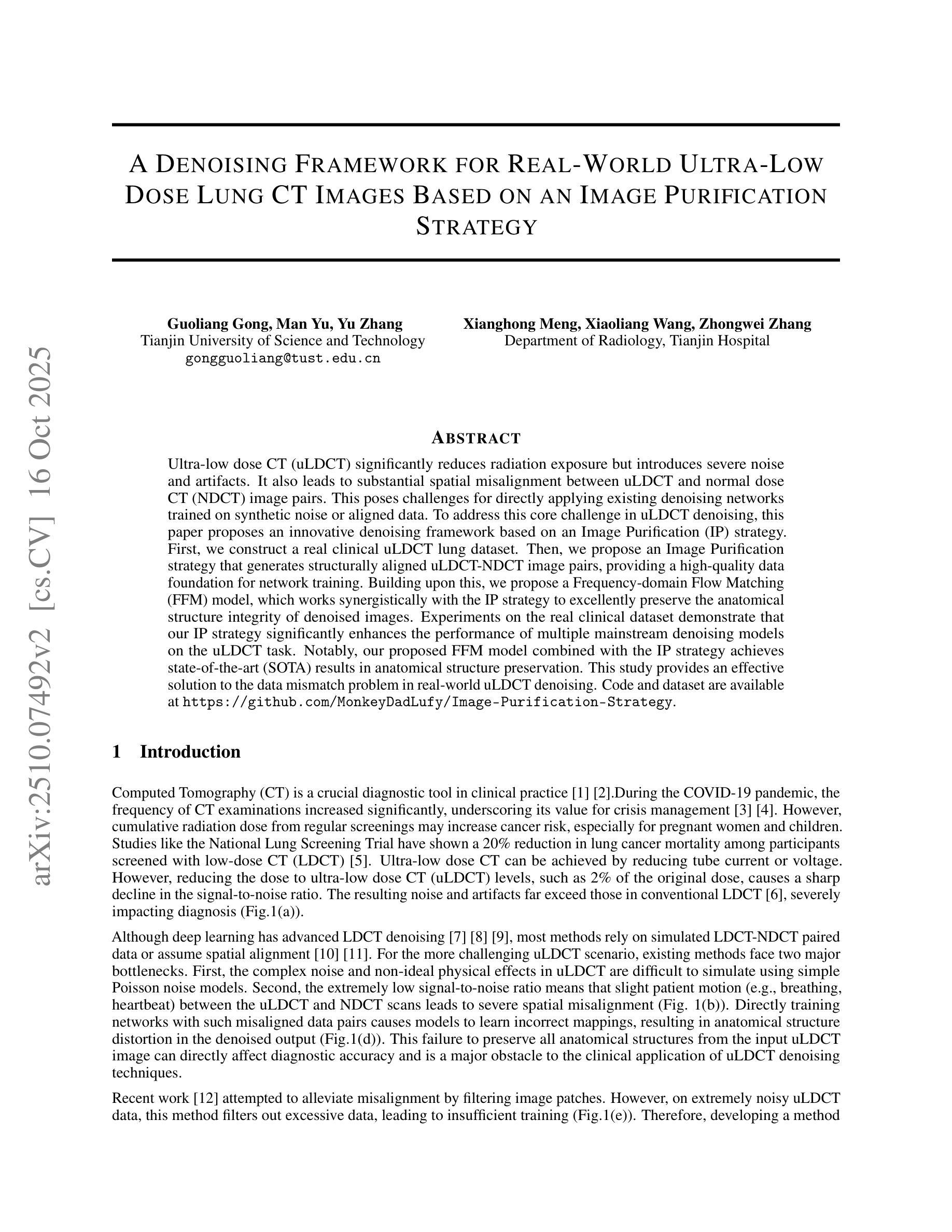 超低剂量CT(uLDCT)显著减少了辐射暴露,但引入了严重的噪声和伪影。它还导致uLDCT与正常剂量CT(NDCT)图像对之间出现较大的空间错位。这为直接应用现有合成噪声或对齐数据训练的降噪网络带来了挑战。针对uLDCT降噪中的这一核心挑战,本文提出了一种基于图像净化(IP)策略的降噪框架。首先,我们构建了真实的临床uLDCT肺部数据集。然后,我们提出了一种图像净化策略,生成结构对齐的uLDCT-NDCT图像对,为网络训练提供高质量的数据基础。在此基础上,我们提出了频域流匹配(FFM)模型,该模型与IP策略协同工作,出色地保留了去噪图像的解剖结构完整性。在真实临床数据集上的实验表明,我们的IP策略显著提高了多个主流降噪模型在uLDCT任务上的性能。值得注意的是,我们提出的FFM模型与IP策略相结合,在解剖结构保留方面达到了最新水平。本研究为解决真实世界uLDCT降噪中的数据不匹配问题提供了有效解决方案。代码和数据集可在https://github.com/MonkeyDadLufy/flow-matching获取。