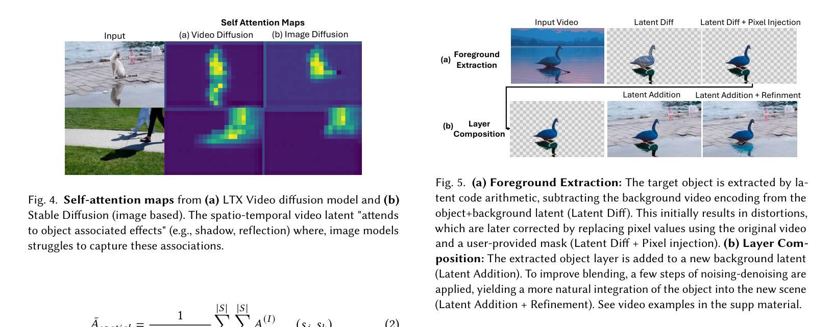 在Omnimatte中,我们的目标是将给定的视频分解成语义上有意义的层次,包括背景和各种独立物体及其相关的效果,如阴影和反射。现有的方法通常需要大量的训练或昂贵的自监督优化。在本文中,我们提出了OmnimatteZero,这是一种无需训练的方法,它利用现成的预训练视频扩散模型进行omnimatte操作。OmnimatteZero可以从视频中移除物体,提取独立物体层次及其效果,并将这些物体合成到新的视频中。这是通过适应零样本图像补全技术来完成视频物体移除的任务,而这是一个他们无法有效处理的开箱即用任务。为了克服这一点,我们引入了时间和空间的注意力指导模块,以引导扩散过程,实现准确的物体移除和背景重建的时间一致性。我们进一步显示自我关注图捕捉物体的信息及其足迹,并使用它们来补全物体的效果,留下干净的背景。此外,通过简单的潜在算术运算,可以无缝地隔离物体层次并与新的视频层次重新组合,以产生新的视频。评估结果表明,OmnimatteZero不仅在背景重建方面表现出卓越的性能,而且为Omnimatte方法创造了新的记录,实现了实时性能,帧运行时间最短。