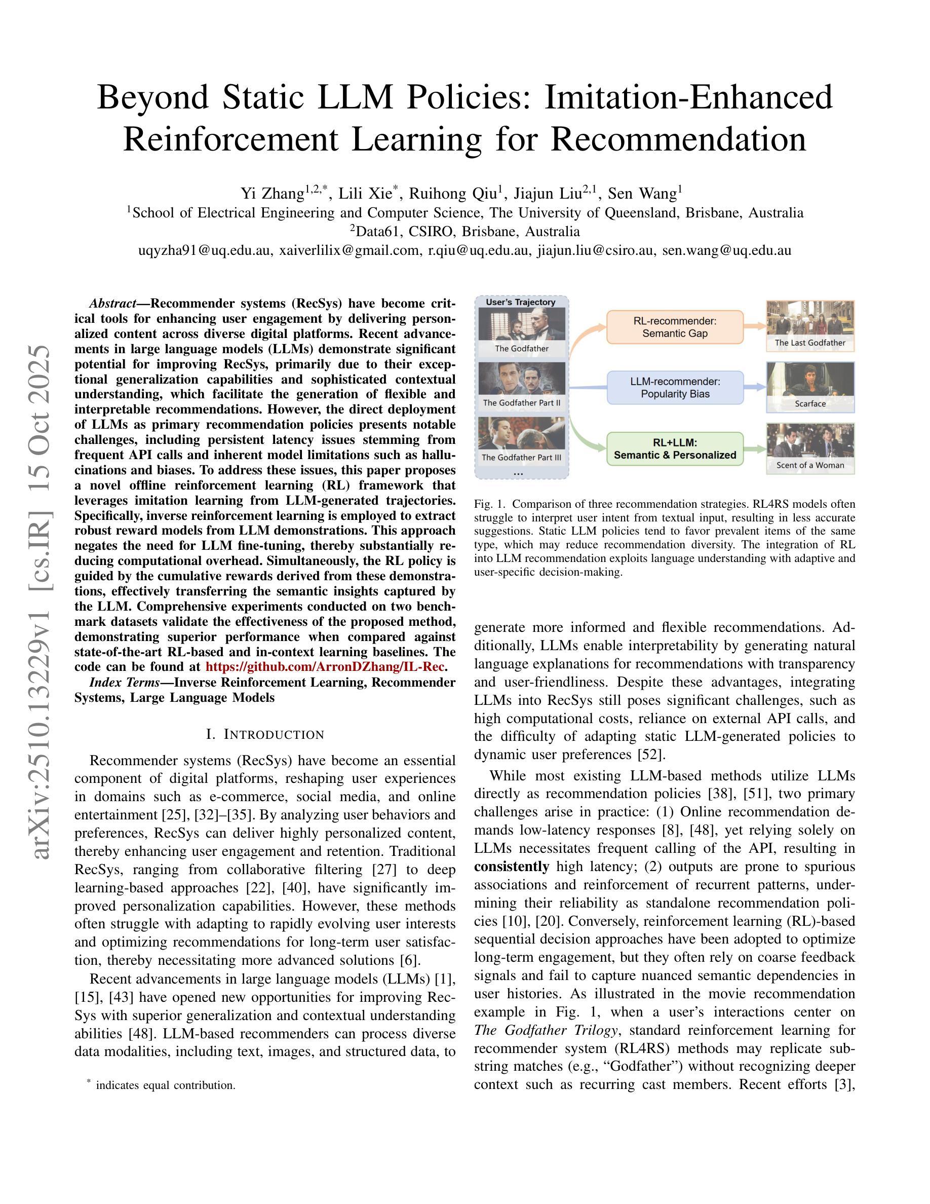 推荐系统(RecSys)已成为通过不同数字平台提供个性化内容来提高用户参与度的重要工具。大型语言模型(LLM)的最新进展显示出在提高推荐系统方面的巨大潜力,这主要是因为它们出色的泛化能力和复杂上下文理解,有助于生成灵活且可解释的建议。然而,直接将大型语言模型作为主要的推荐策略部署会遇到一些挑战,包括源于频繁API调用的持久延迟问题,以及模型本身的固有局限性,如幻想和偏见。为了解决这些问题,本文提出了一种新型的离线强化学习(RL)框架,该框架利用从大型语言模型生成的轨迹进行模仿学习。具体来说,采用逆向强化学习从大型语言模型的演示中提取稳健的奖励模型。这种方法避免了大型语言模型的精细调整需求,从而大大减少了计算开销。同时,强化学习政策由这些演示中得出的累积奖励来指导,有效地转移了大型语言模型捕获的语义洞察力。在基准数据集上进行的综合实验验证了所提出方法的有效性,与最新的强化学习方法和上下文学习基线相比,表现出卓越的性能。代码可在https://github.com/ArronDZhang/IL-Rec找到。