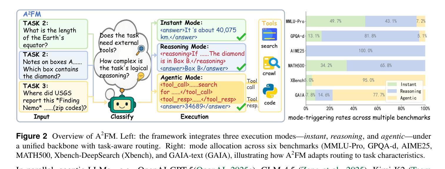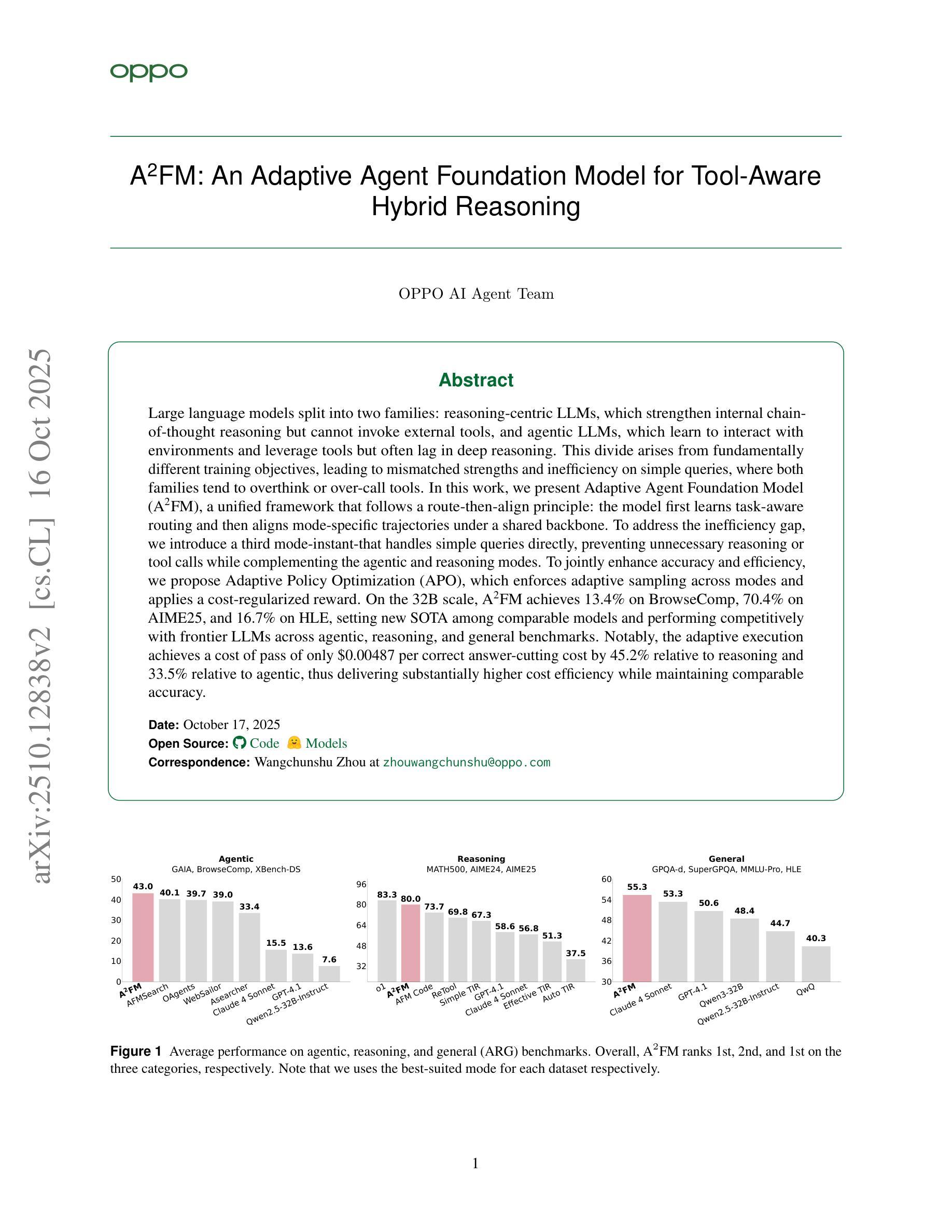 大型语言模型分为两个家族:注重内部推理过程的推理中心型LLM和能够与环境互动并利用工具但深度推理能力较弱的代理型LLM。两者源于不同的训练目标,在处理简单查询时往往存在能力不匹配、效率不高的问题。本文提出了自适应代理基金会模型(A²FM),采用“先路由后对齐”的原则,模型首先学习任务感知路由,然后在共享主干下对齐特定模式轨迹。为解决效率差距问题,引入第三种即时模式,直接处理简单查询,避免不必要的推理或工具调用,同时补充代理和推理模式。通过自适应策略优化(APO),对三种模式进行自适应采样并应用成本正则化奖励,以提高准确性和效率。在32B规模上,A²FM在BrowseComp上达到13.4%,在AIME25上达到70.4%,在HLE上达到16.7%,在同类模型中表现最佳,并在前沿LLM的基准测试中表现良好。特别是自适应执行只需每正确回答一个问题花费0.00487的成本,相较于推理模式和代理模式分别降低了45.2%和33.5%的成本,实现了高成本效益与良好准确性的平衡。