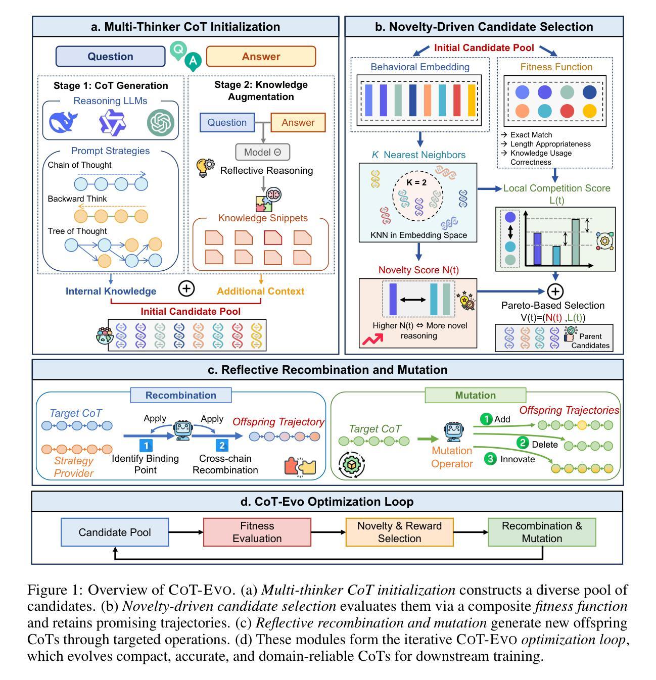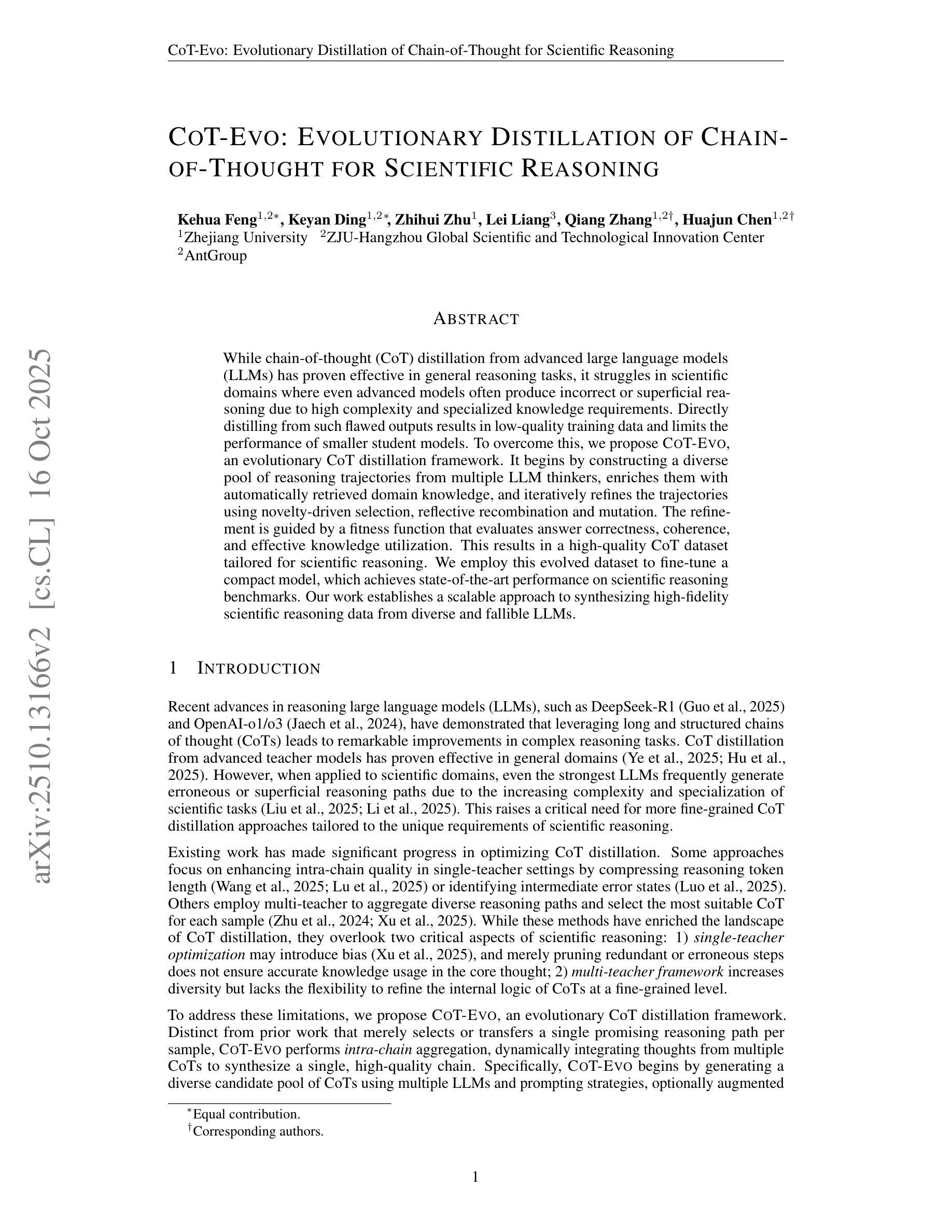 虽然基于先进的大型语言模型(LLM)的思维链(CoT)蒸馏技术在一般推理任务中已被证明是有效的,但在科学领域,由于高度复杂性和专业知识要求,即使是先进模型也往往会产生错误或肤浅的推理。直接从这种有缺陷的输出中进行蒸馏会导致训练数据质量低下,并限制小型学生模型的性能。为了克服这一问题,我们提出了CoT-Evo,这是一个进化的CoT蒸馏框架。它首先从不同LLM思考者构建多样化的推理轨迹池,通过自动检索领域知识来丰富它们,并通过新奇性驱动的选择、反思性重组和突变来迭代优化这些轨迹。优化由适应度函数引导,该函数评估答案的正确性、连贯性和有效的知识利用。这产生了一个针对科学推理量身定制的高质量CoT数据集。我们使用这个进化数据集对紧凑模型进行微调,该模型在科学素养评估上达到了最先进的性能。我们的工作建立了一种从多样化和易出错的LLM中合成高保真科学推理数据的方法。