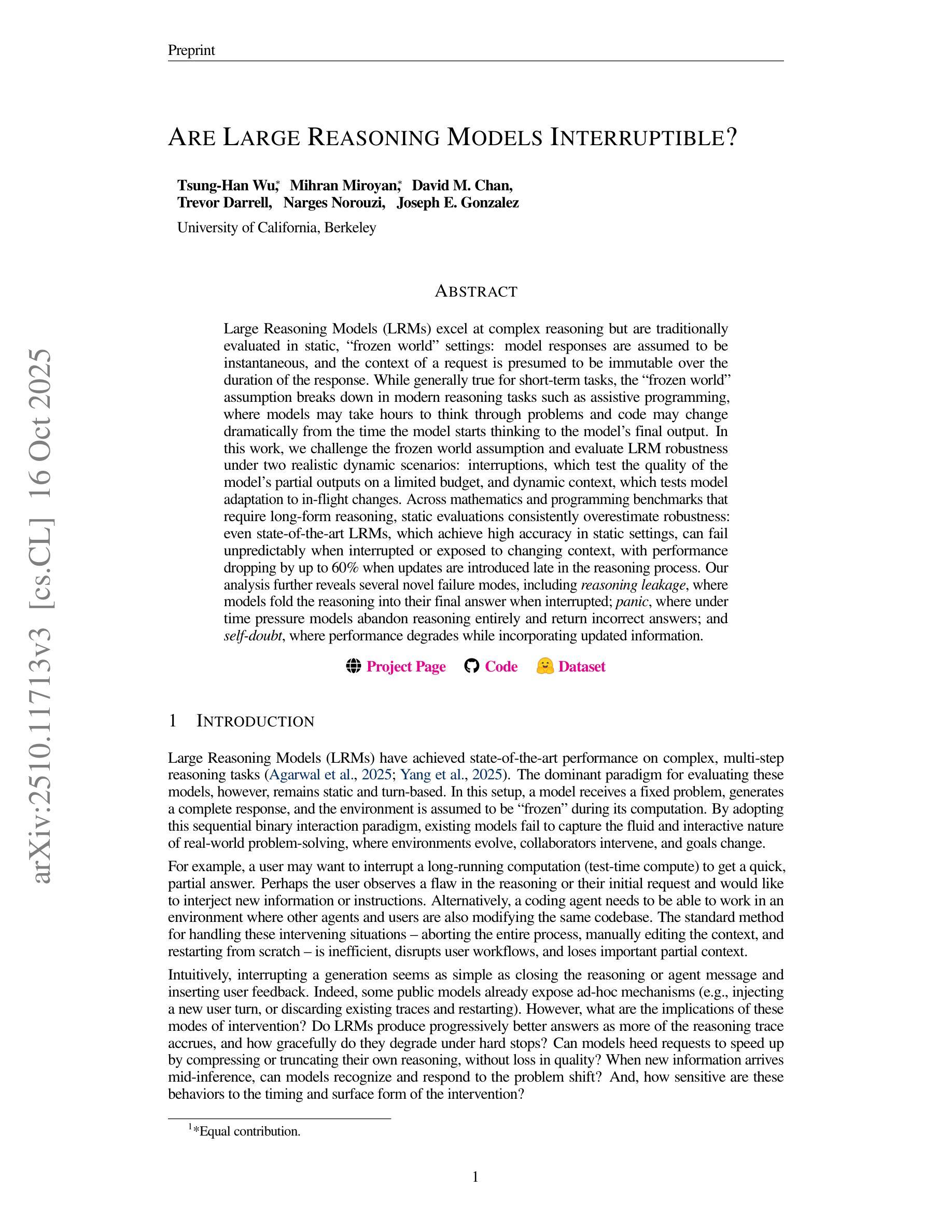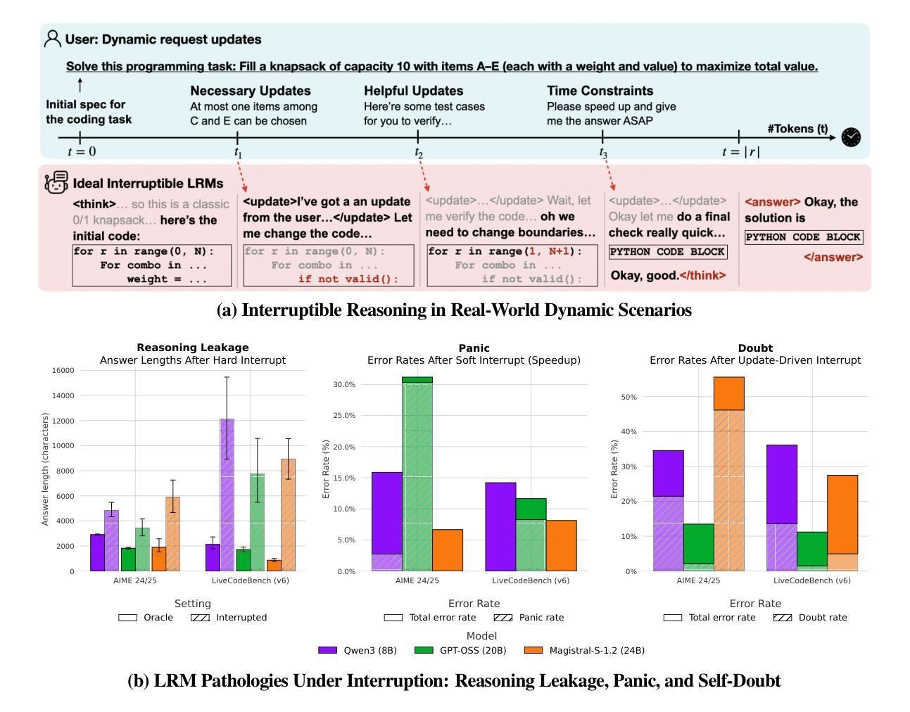 大型推理模型(LRMs)擅长处理复杂的推理任务,但传统的评估方式常常是在静态的“冻结世界”设定下进行。模型响应被假设为瞬时完成,请求的背景在响应过程中保持不变。虽然这一假设在短期任务中大致适用,但在现代推理任务如辅助编程中,模型可能需要数小时来思考问题,代码从模型开始思考到最终输出的过程中可能会发生显著变化。本文挑战了“冻结世界”假设,并在两个现实动态场景下评估了LRM的稳健性:中断和动态上下文。在数学和编程基准测试中的长形式推理任务显示,静态评估往往会高估模型的稳健性:即使在静态环境中表现高超的LRMs,在面对中断或变化上下文时,性能可能会意外下降,在推理过程中后期引入更新时,性能可能会下降高达60%。