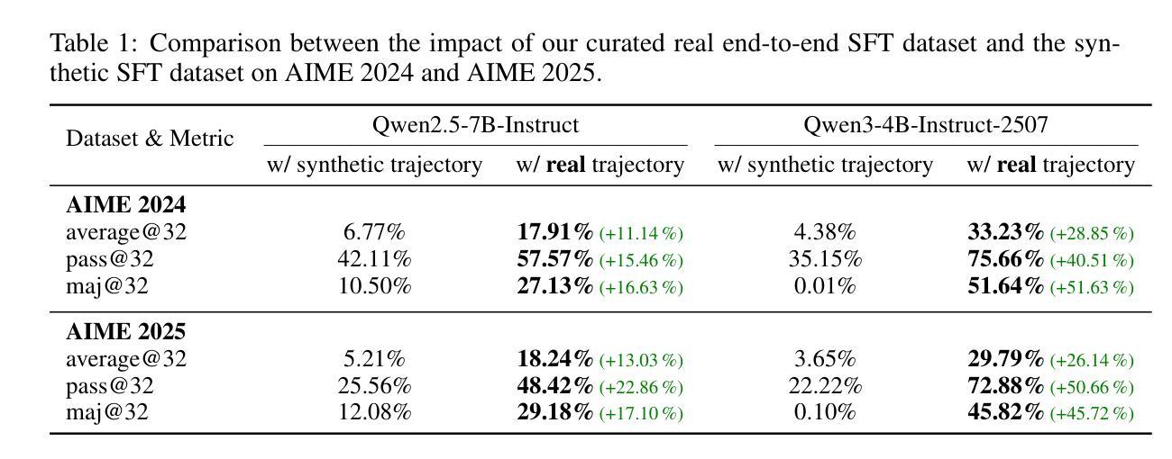 - 使用真实端到端的工具使用轨迹替换合成轨迹,能有效提高模型性能。