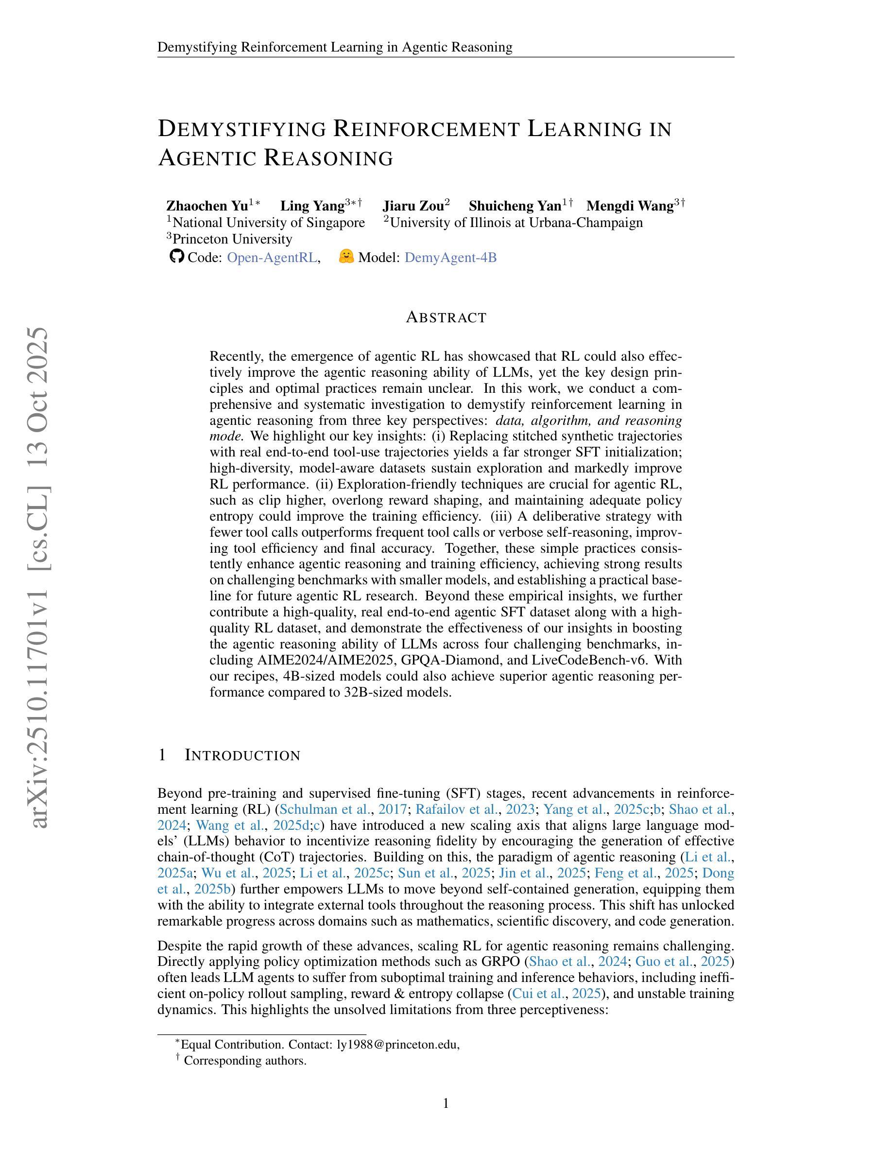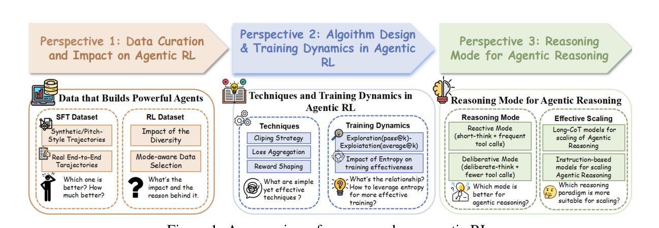 最近,代理强化学习(agentic RL)的出现展示了一个事实,即强化学习可以有效地提高大型语言模型(LLMs)的代理推理能力,然而关键的设计原则和最佳实践仍然不明确。在这项工作中,我们从数据、算法和推理模式这三个关键角度对强化学习在代理推理中的奥秘进行了全面系统的研究。我们强调了我们的关键见解:首先,(i)用真实的端到端工具使用轨迹替换拼接的合成轨迹,会产生更强的SFT初始化效果;高多样性、模型感知的数据集维持探索并显著提高了强化学习的性能。(ii)探索友好的技术对于代理强化学习至关重要,如clip higher、过度奖励塑造以及保持适当的策略熵可以提高训练效率。(iii)采用工具调用较少的审慎策略优于频繁的工具调用或冗长的自我推理,能够提高工具效率和最终准确性。总的来说,这些简单的实践始终提高了代理推理和训练效率,在具有挑战性的基准测试上取得了显著成果,即使是小模型也表现出了强大的性能,为未来代理强化学习研究建立了实用的基准线。除了这些经验见解之外,我们还进一步贡献了一个高质量的端到端代理SFT数据集和一个高质量的RL数据集,并证明了我们的见解在提高大型语言模型的代理推理能力方面的有效性,跨越四个具有挑战性的基准测试,包括AIME2024/AIME2025、GPQA-Diamond和LiveCodeBench-v6。借助我们的方法,即使规模为4B的模型也能在代理推理性能上超越规模为32B的模型。代码和模型可通过https://github.com/Gen-Verse/Open-AgentRL访问。