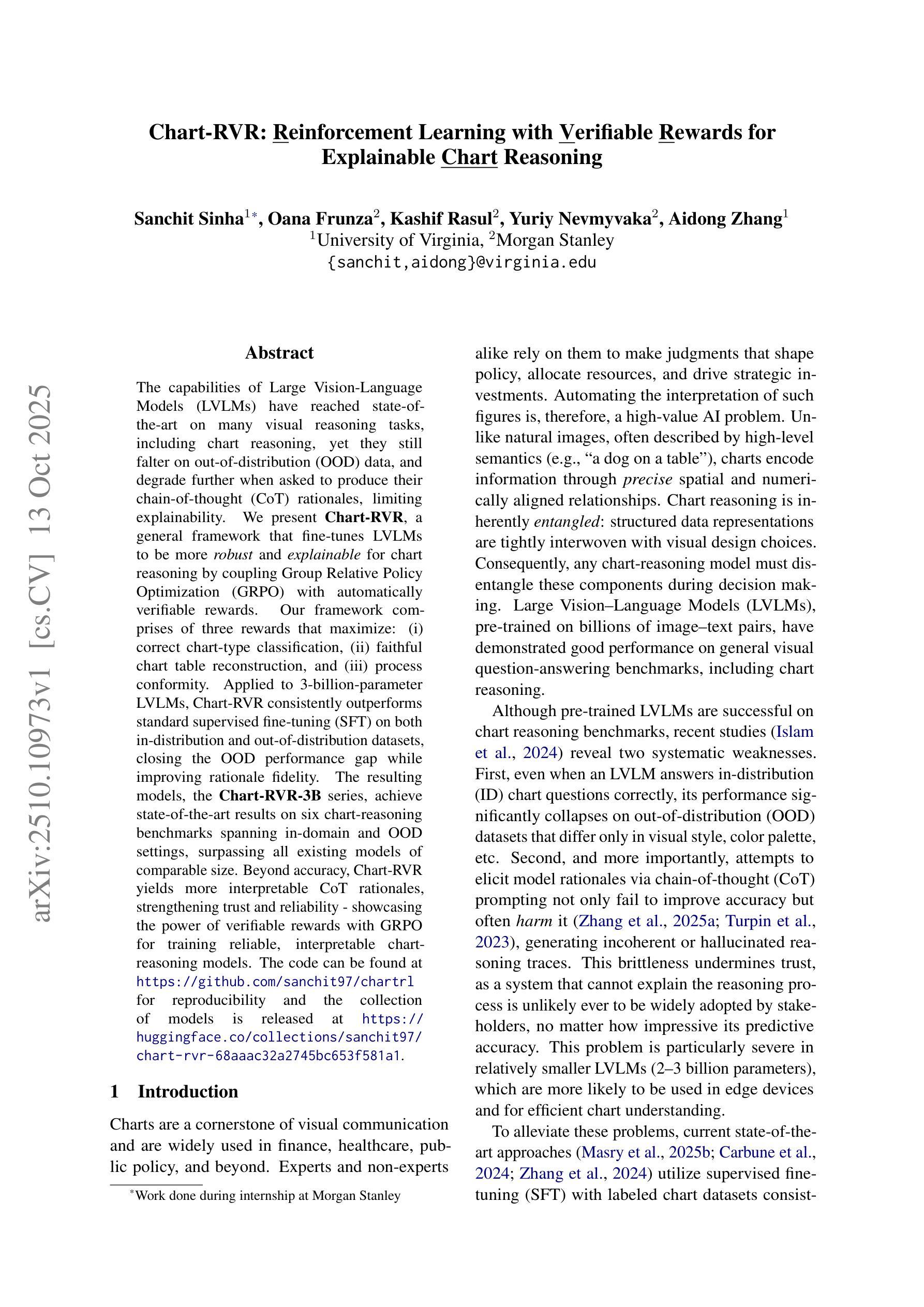 大型视觉语言模型(LVLMs)在视觉推理任务上达到了最新技术水平,但在分布外数据上仍然存在问题,并且在产生思维链(CoT)解释时性能会进一步下降。为了解决这个问题,我们提出了Chart-RVR框架,它通过结合群体相对策略优化(GRPO)和可自动验证的奖励来微调LVLMs,使其对图表推理更加稳健和可解释。该框架包括三个奖励,以最大化:(i)正确的图表类型分类,(ii)忠实的图表重建,(iii)流程一致性。在3亿参数LVLMs上的应用表明,Chart-RVR在内部和外部数据集上的性能均优于标准监督微调(SFT),缩小了OOD性能差距,同时提高了解释性。Chart-RVR系列模型在涵盖内部和外部设置的六个图表推理基准测试上达到了最新技术水平。除了准确性之外,Chart-RVR还产生了更具解释性的思维链解释,增强了信任和可靠性。
