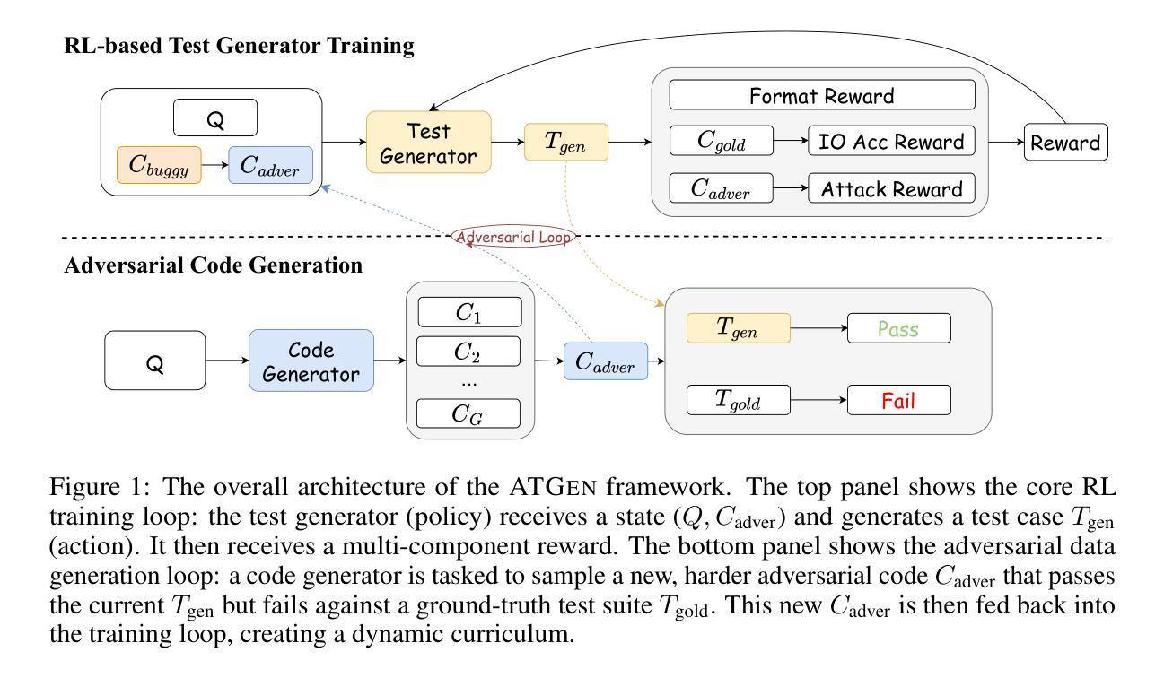 大型语言模型(LLM)在代码生成方面表现出色,但它们的输出常常含有微妙的错误,有效的测试用例是关键的瓶颈。现有的测试生成方法,无论基于提示还是监督微调,都依赖于静态数据集。这设定了一个“固定难度上限”,从根本上限制了它们发现训练范围之外的新颖或更复杂错误的能力。为了克服这一点,我们引入了ATGen,一个通过对抗性强化学习来训练测试用例生成器的框架。ATGen将测试生成器与对抗性代码生成器相对抗,后者不断制造更难以解决的错误来逃避当前策略。这种动态循环创建了一个难度不断增加的课程,以挑战当前策略。测试生成器通过强化学习(RL)进行优化,以最大化“输出准确性”和“攻击成功性”,使其能够学习一个逐渐强大的策略,打破静态训练的固定难度上限。大量实验表明,ATGen显著优于最新基线。我们进一步验证了其在实践中的实用性,表明它既是更有效的Best-of-N推理过滤器,也是更高质量的代码生成模型训练奖励来源。我们的工作为提高LLM生成代码的可靠性建立了新的动态范式。