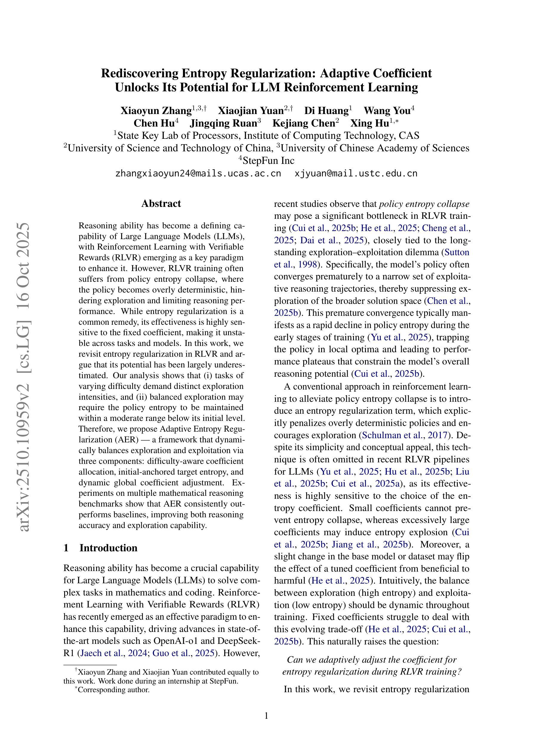 大语言模型的推理能力已经成为一种重要的特性,强化学习加可验证奖励(RLVR)是提高这种能力的一种关键方法。然而,RLVR训练常遇到策略熵崩溃的问题,限制了模型的探索能力和推理性能。本文重新审视了RLVR中的熵正则化方法,并提出了自适应熵正则化(AER)框架,通过动态平衡探索与利用,包括难度感知系数分配、初始锚定目标熵和动态全局系数调整三个关键组件。实验证明,AER在多个数学推理基准测试中表现优异,提高了推理准确性和探索能力。