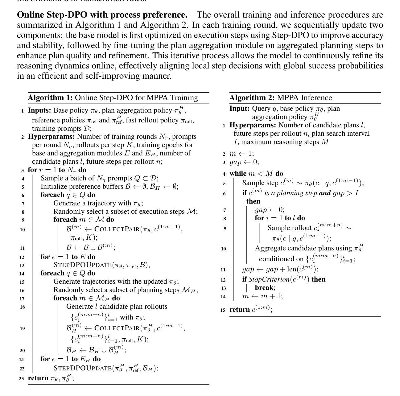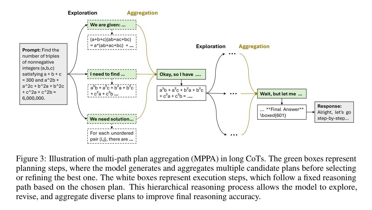 推理时间缩放通过扩展语言模型的思维链(CoT)提升其推理能力。然而,现有方法通常在一次前向传递中生成整个推理链,这常常导致思维链脱轨,即由于累积错误导致推理轨迹偏离正确方向。对于具有较长思维链的小型语言模型,这个问题尤为严重,因为它们的能力有限。为了解决这个问题,我们分析原始的长思维链并揭示了一个由规划和执行步骤组成的推理层次结构。我们的分析表明,大多数推理错误源于规划不正确。受此观察的启发,我们提出了多路径计划聚合(MPPA)框架,它通过计划探索和聚合来增强单路径推理。遵循基于令牌位置的可变间隔调度,MPPA生成多个候选计划并将其聚合到精细的规划步骤中。为了保持效率,我们采用了最小设计,其中基础语言模型充当主要策略,而轻量级的LoRA模块实现计划聚合策略。我们进一步观察到,对于超过4K令牌的长轨迹,结果奖励强化学习是低效的。为了克服这一点,我们引入了在线Step-DPO,这是一种过程级偏好优化方案,它利用扭曲序贯蒙特卡洛(TSMC)提供可伸缩的逐步监督,并使用小型语言模型。这带来了更有效的训练、更高的稳定性和准确性。在具有挑战性的数学、科学和逻辑推理基准测试上的广泛实验表明,仅使用10%的SFT数据和5%的偏好对,我们的方法在多个基础模型和任务上超越了DeepSeek-R1蒸馏基准测试和结果奖励强化学习基准测试。