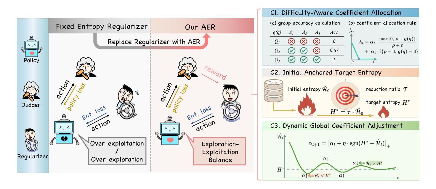 - AER包括难度感知系数分配、初始锚定目标熵和动态全局系数调整三个关键组件。