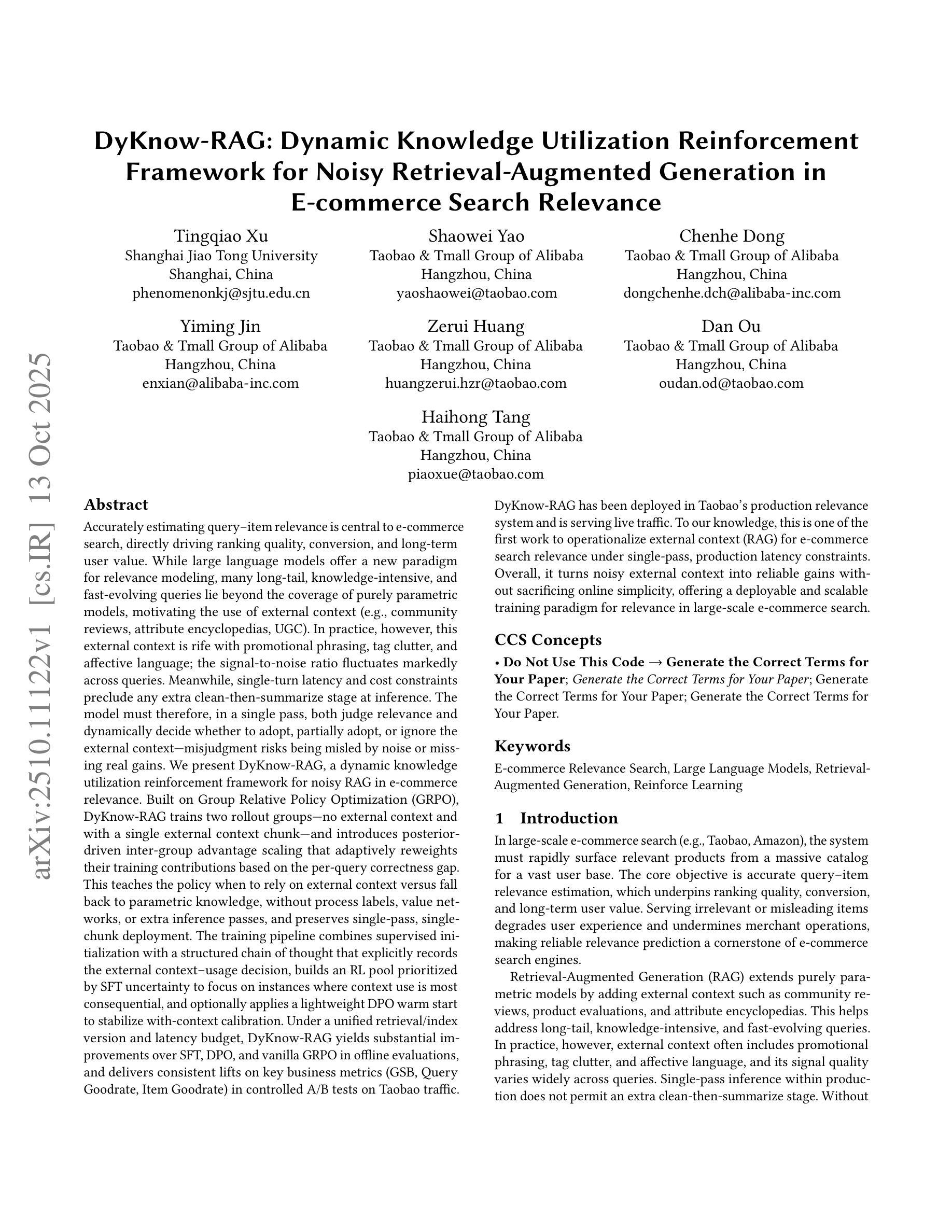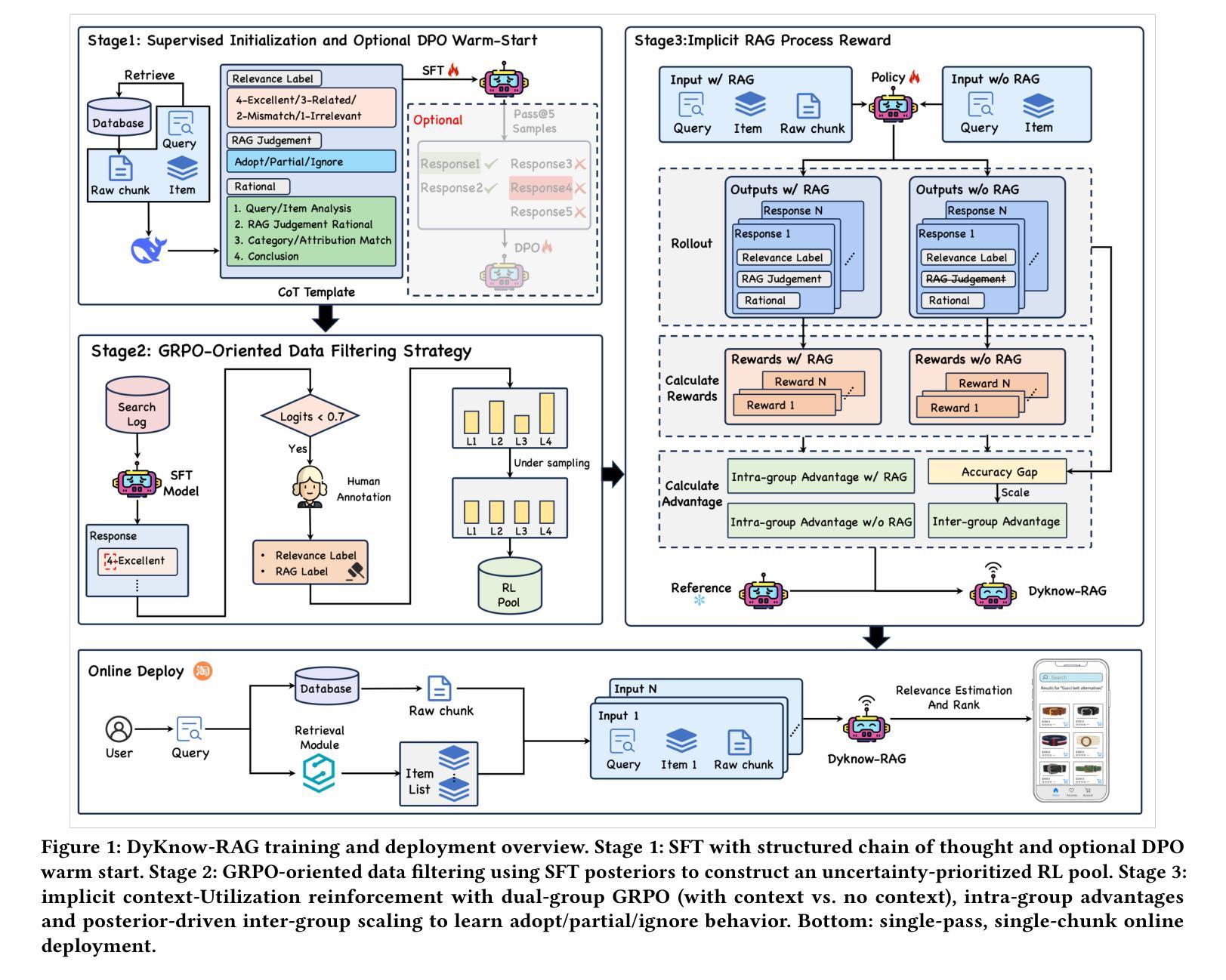 准确地对查询项目相关性进行建模是推动电子商务排名的重要因素。然而,长尾、知识密集型和快速演变的查询超出了参数化大型语言模型的覆盖范围。外部上下文(评论、属性百科全书、用户生成内容)可能有所帮助,但存在噪声干扰,单次传递的延迟和成本不允许进行任何清理然后进行摘要的步骤。该模型必须针对每个查询,判断相关性并决定是否使用、部分使用或忽略上下文。DyKnow-RAG是一个基于群组相对策略优化的动态噪声RAG框架。它训练了两个演练组(无外部上下文与单个检索块),并应用了后验驱动组间优势缩放,这可以根据每个查询的正确性差距自适应地重新加权其贡献。这教会了模型在何时信任检索与何时回退到参数化知识之间做出选择,而无需处理标签、价值网络或额外的推理传递,从而保持了生产延迟下的单次传递、单个块部署。训练结合了:(1)使用结构化理由的监督初始化,明确记录上下文使用决策;(2)由SFT不确定性优先的强化学习池,以集中关注上下文选择最关键的方面;(3)一个可选的轻量级DPO预热来稳定上下文校准。在统一的检索/索引和固定的延迟预算下,DyKnow-RAG在离线测试中优于SFT、DPO和简单的GRPO,在淘宝的A/B测试中,对GSB、查询好率和项目好率实现了持续的提升。它已部署在淘宝的生产相关性系统中,为实时流量提供服务。据我们所知,它是电子商务相关性中首个单通道RAG解决方案,能够将嘈杂的外部信号转化为可靠的收益,而无需增加在线复杂性。