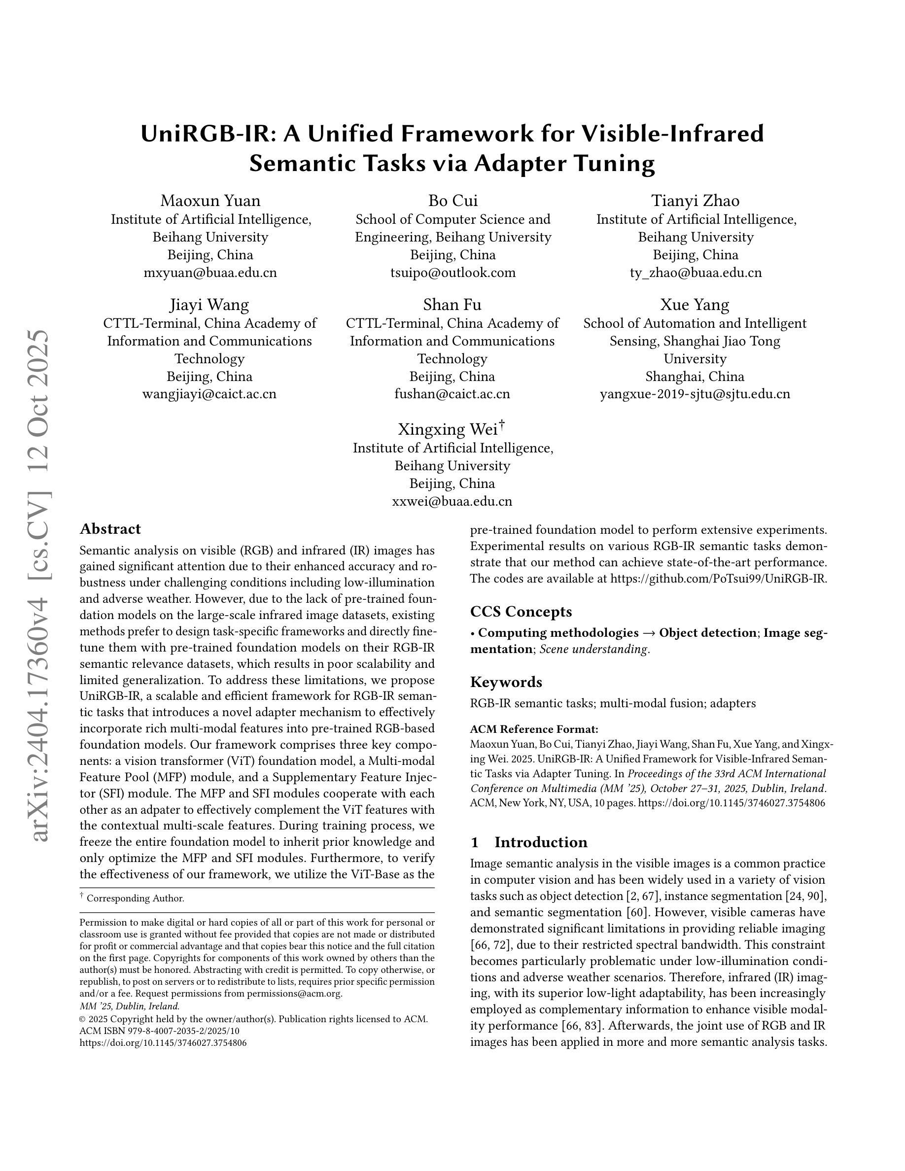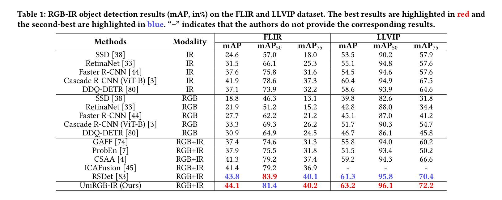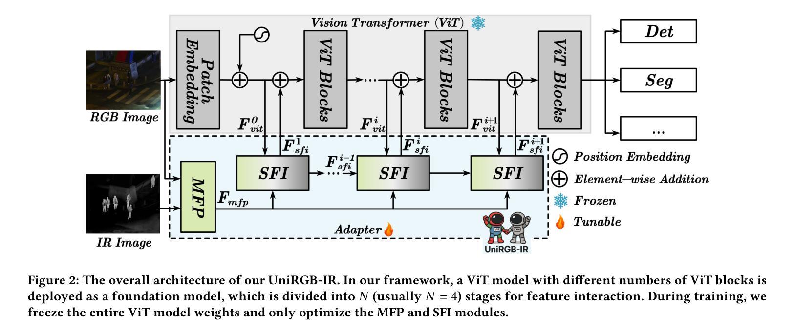 - UniRGB-IR框架引入了一种新型适配器机制,能有效结合丰富的多模态特征到预训练的RGB基础模型中。