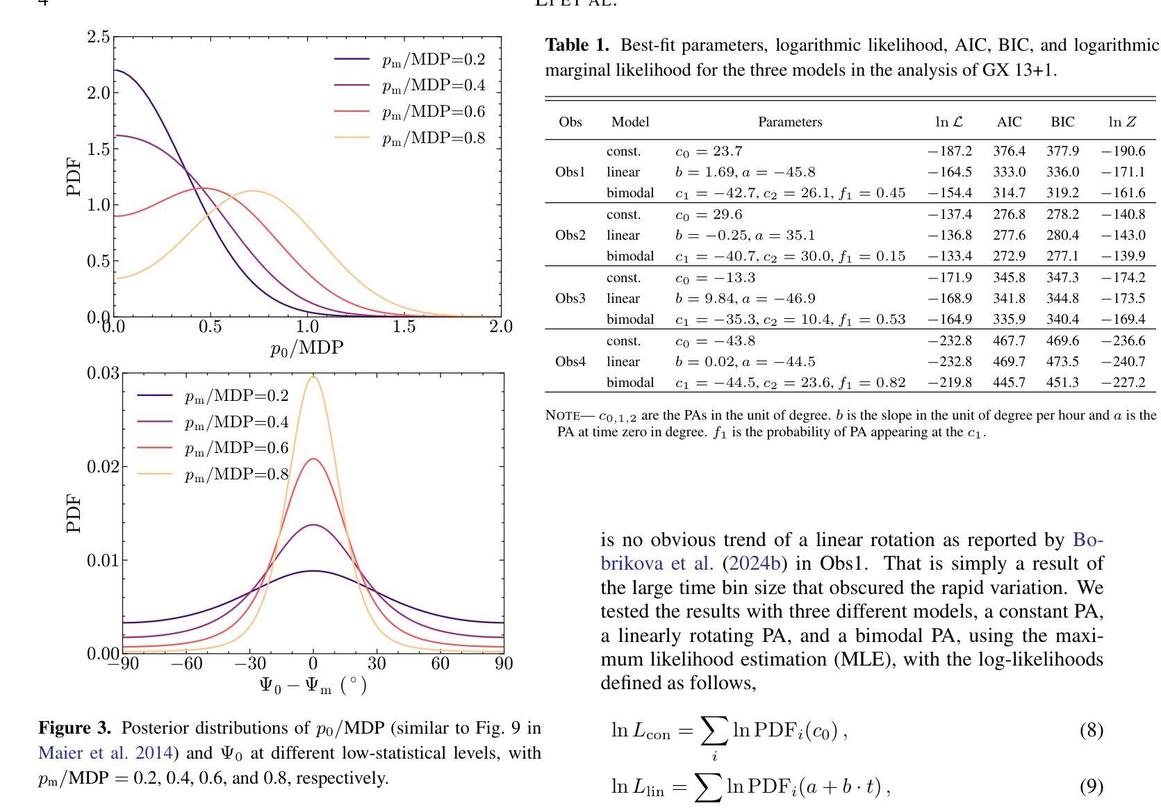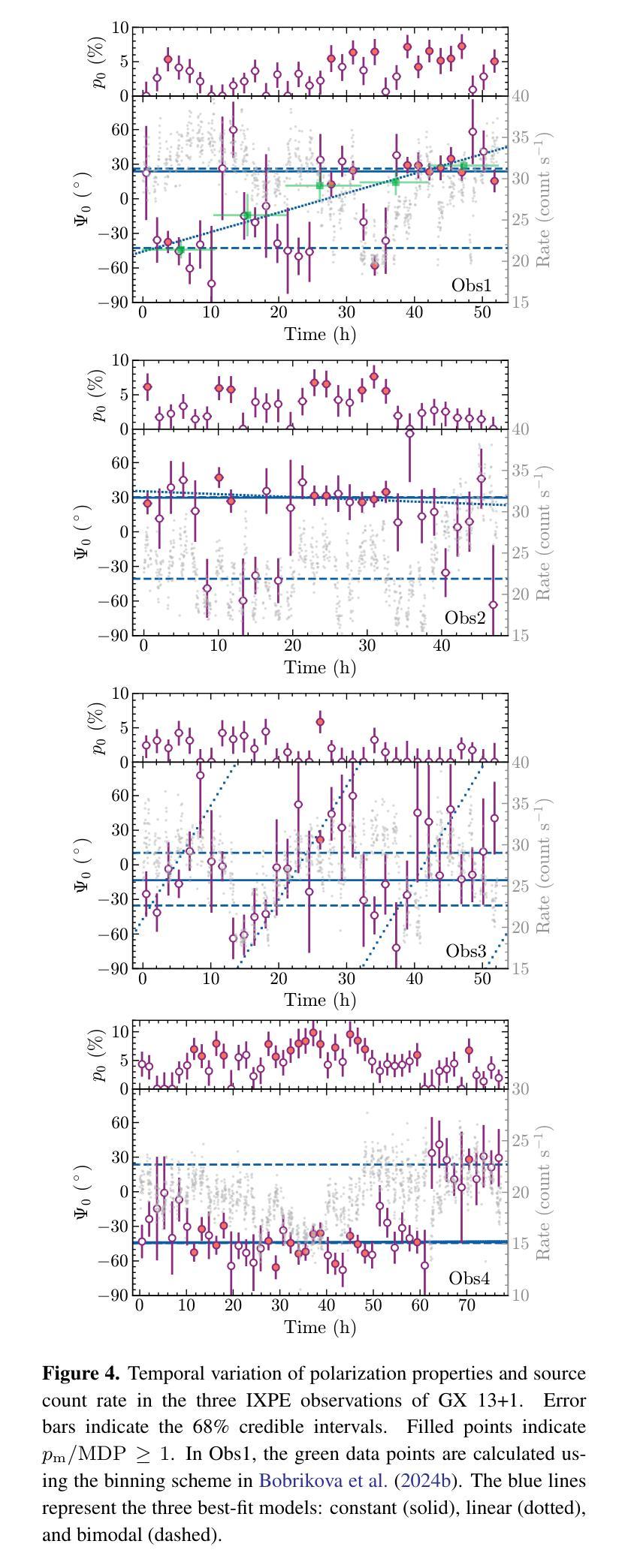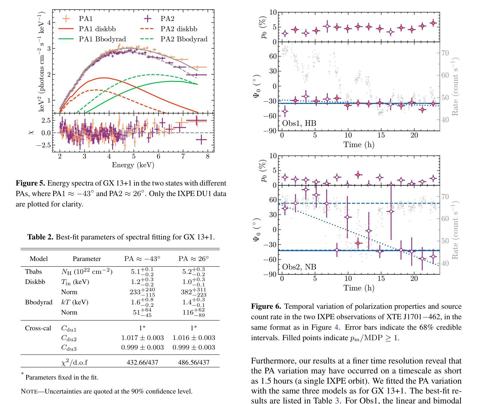 - 在GX 13+1中观测到偏振角变化并非线性旋转模式,暗示存在两个发射成分竞争。
