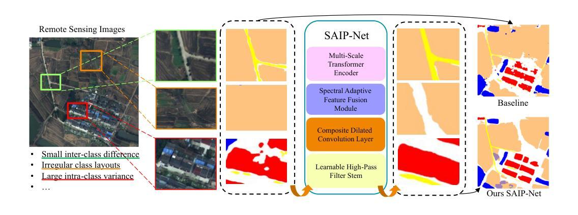 遥感影像的语义分割要求精确的空间边界和稳健的类内一致性,这对传统的层次模型提出了挑战。为了解决由空间域特征融合和感受野不足而产生的局限性,本文引入了SAIP-Net,这是一种新型的频率感知分割框架,利用谱自适应信息传播。SAIP-Net采用自适应频率滤波和多尺度感受野增强,有效地抑制了类内特征的不一致性,提高了边界线的清晰度。综合实验表明,该方法在最新方法的基础上显著提高了性能,突出了谱自适应策略与扩展感受野在遥感图像分割中的有效性。