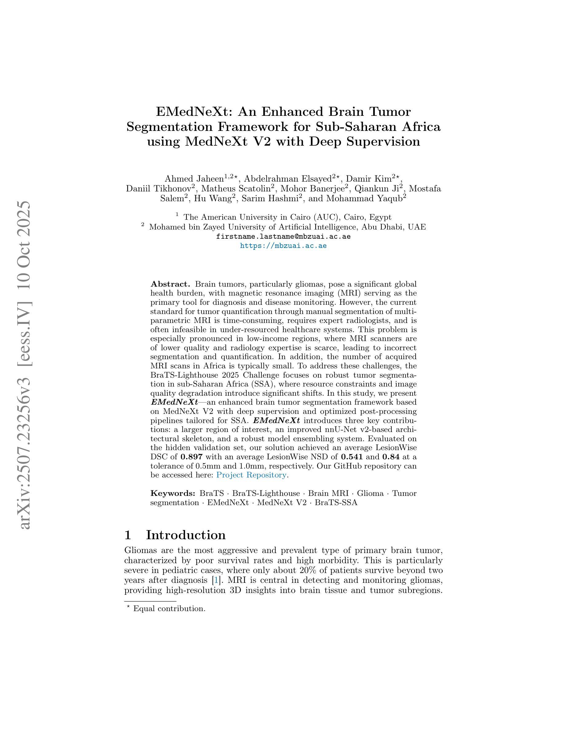 脑癌影响全球数百万人,在几乎所有的临床环境中,医生都依赖磁共振成像(MRI)来诊断和监测胶质瘤。然而,通过多参数MRI进行肿瘤量化的手动分割是目前的标准,这不仅耗时,需要专家放射科医生,而且在资源不足的卫生系统中通常不可行。这一问题在低收入地区尤为突出,那里的MRI扫描仪质量较低,放射学专家稀缺,导致分割和量化不准确。此外,非洲获得的MRI扫描次数通常较少。为了解决这些挑战,BraTS-Lighthouse 2025 Challenge专注于撒哈拉以南非洲(SSA)的稳健肿瘤分割,资源约束和图像质量退化引入了重大变化。在这项研究中,我们提出了EMedNeXt——一个基于MedNeXt V2的增强型脑肿瘤分割框架,具有深度监督和针对SSA优化的后处理流水线。EMedNeXt引入了三个主要贡献:更大的感兴趣区域、改进的nnU-Net v2基础架构和稳健的模型集成系统。在隐藏验证集上评估,我们的解决方案达到了LesionWise DSC的平均值为0.897,LesionWise NSD的平均值为0.541,在0.5毫米和1.0毫米的容忍度下分别为0.84。