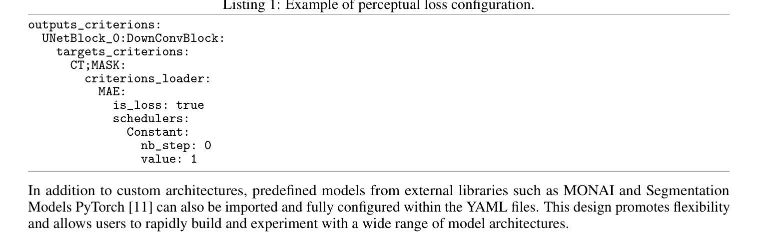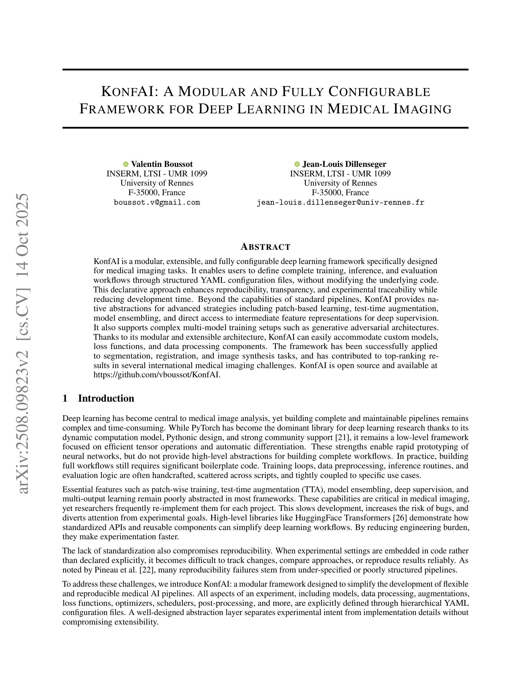 KonfAI是一个模块化、可扩展和完全可配置的深度学习框架,专为医学影像任务设计。它使用户能够通过结构化的YAML配置文件定义完整的训练、推理和评估工作流程,而无需修改底层代码。这种声明式方法提高了可重复性、透明度和实验可追溯性,同时减少了开发时间。除了标准管道的功能外,KonfAI还提供高级策略的本机抽象,包括基于补丁的学习、测试时增强、模型集成和深度监督的直接访问中间特征表示。它还支持复杂的多模型训练设置,例如生成对抗架构。由于其模块化和可扩展的架构,KonfAI可以轻松容纳自定义模型、损失函数和数据处理组件。该框架已成功应用于分割、注册和图像合成任务,并在多个国际医学影像挑战中获得了顶尖结果。KonfAI是开源的,可在https://github.com/vboussot/KonfAI获取。