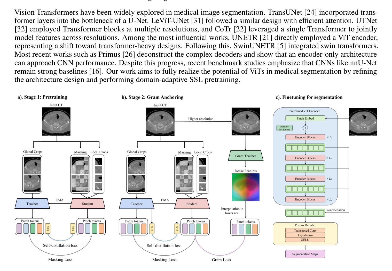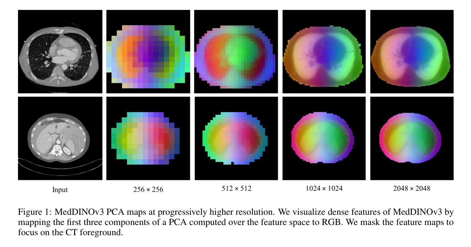 - MedDINOv3通过多阶段DINOv3配方在CT-3M数据集上进行域自适应预训练,设计出具有多尺度令牌聚合的简单有效架构。