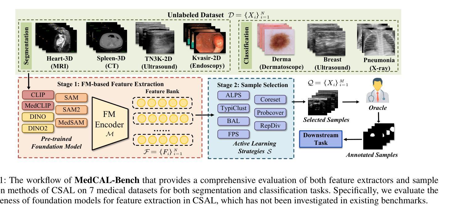 冷启动主动学习(CSAL)旨在在没有先验知识的情况下选择信息样本进行标注,这对于在医学图像分析中使用有限的标注预算提高标注效率和模型性能非常重要。大多数现有的CSAL方法依赖于目标数据集上的自监督学习(SSL)进行特征提取,这是低效的,并且受到特征表示不足的限制。最近,预训练的Foundation Models(FMs)显示出强大的特征提取能力,具有更好的CSAL潜力。然而,这种范式很少受到研究,并且在CSAL任务中缺乏对FM进行比较的基准测试。为此,我们提出了MedCAL-Bench,这是基于FM的医学图像分析的首个系统性CSAL基准测试。我们在7个数据集上评估了14个FM和7个CSAL策略,涉及不同标注预算的分类和分割任务,涵盖了多种医学模态。它也是第一个同时评估特征提取和样本选择阶段的CSAL基准测试。我们的实验结果表明:1)大多数FM对于CSAL都是有效的特征提取器,DINO系列在分割方面表现最佳;2)这些FM在分割任务中的性能差异很大,而在分类任务中的差异较小;3)在不同的数据集上进行CSAL时,应考虑不同的样本选择策略,处理惊喜(ALPS)在分割方面表现最佳,而RepDiv在分类方面领先。代码可在https://github.com/HiLab-git/MedCAL-Bench获取。