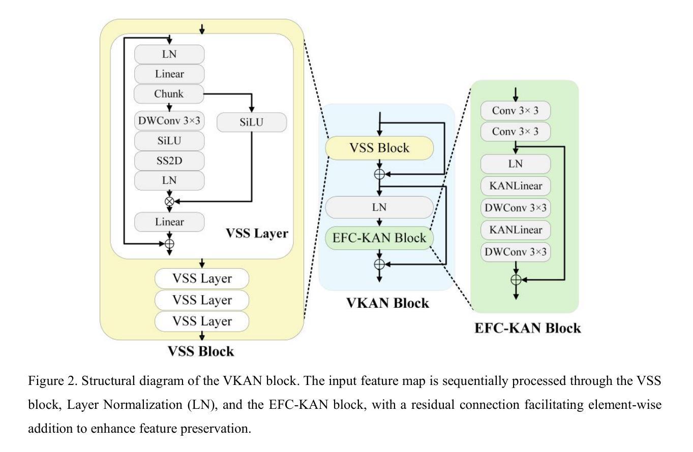 - 提出的VKAN模块结合了VSS和Expanded Field Convolutional KAN(EFC-KAN),作为Transformer模块的替代品。