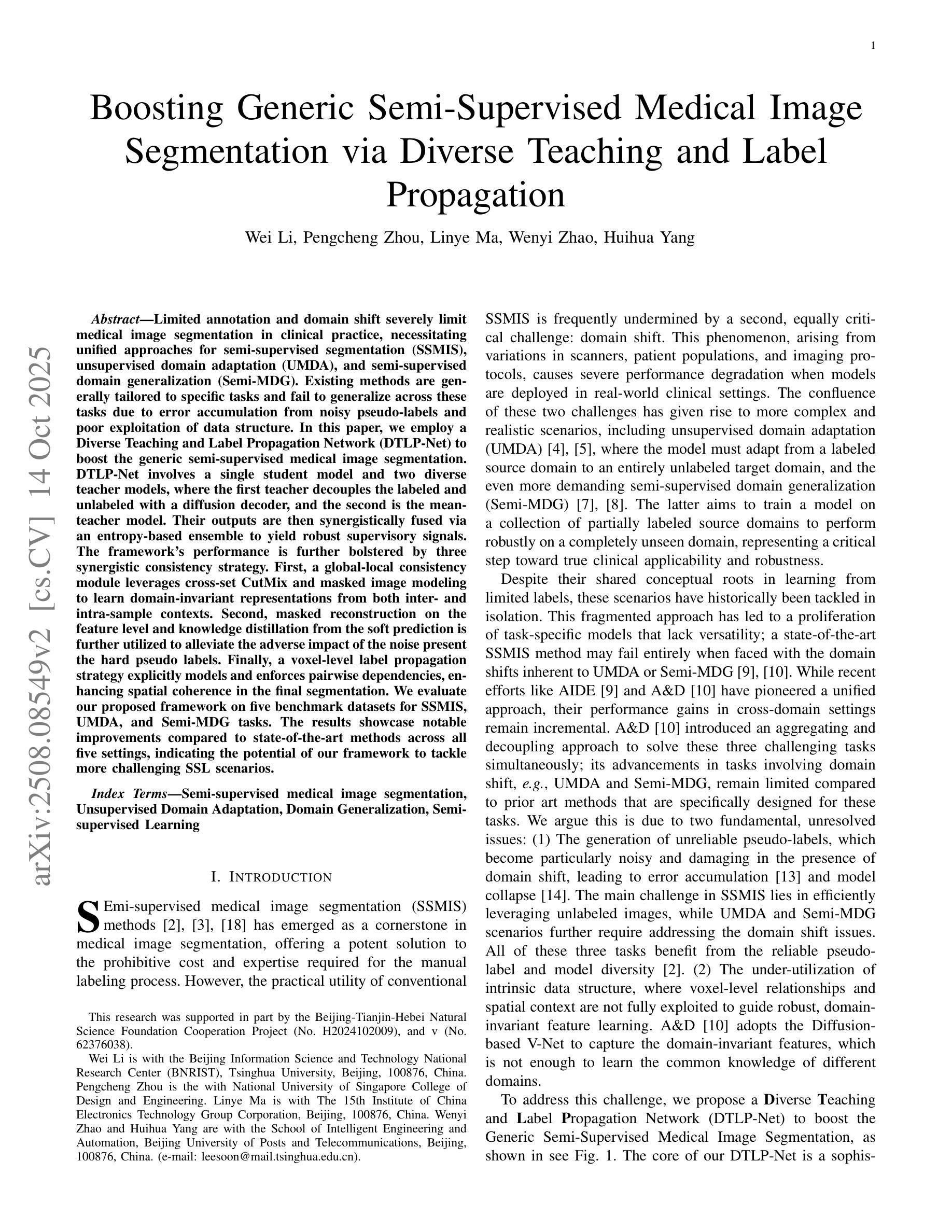 本文研究了医学图像分割中遇到的有限标注与领域偏移两大挑战,并衍生出半监督医学图像分割(SSMIS)、半监督医学领域泛化(Semi-MDG)和无监督医学领域自适应(UMDA)等场景。针对现有方法在处理这些任务时积累误差、无法有效利用无标签数据的问题,本文提出一种通用框架,旨在掌握所有三个任务。为解决领域偏移下无标签数据的可靠伪标签生成问题,本文采用多样化教学及标签传播网络(DTLP-Net)增强通用半监督医学图像分割。DTLP-Net包括一个学生模型和两个多样化的教师模型,能为学生模型生成可靠的伪标签。同时,采用样本间和样本内的数据增强,学习全局和局部知识。此外,为捕捉体素级关联,本文提出标签传播以增强模型的稳健性。在五个基准数据集上的评估结果表明,与现有最佳方法相比,本文提出的框架在所有五个设置中都取得了显著的改进,显示出解决更复杂的SSL场景的潜力。