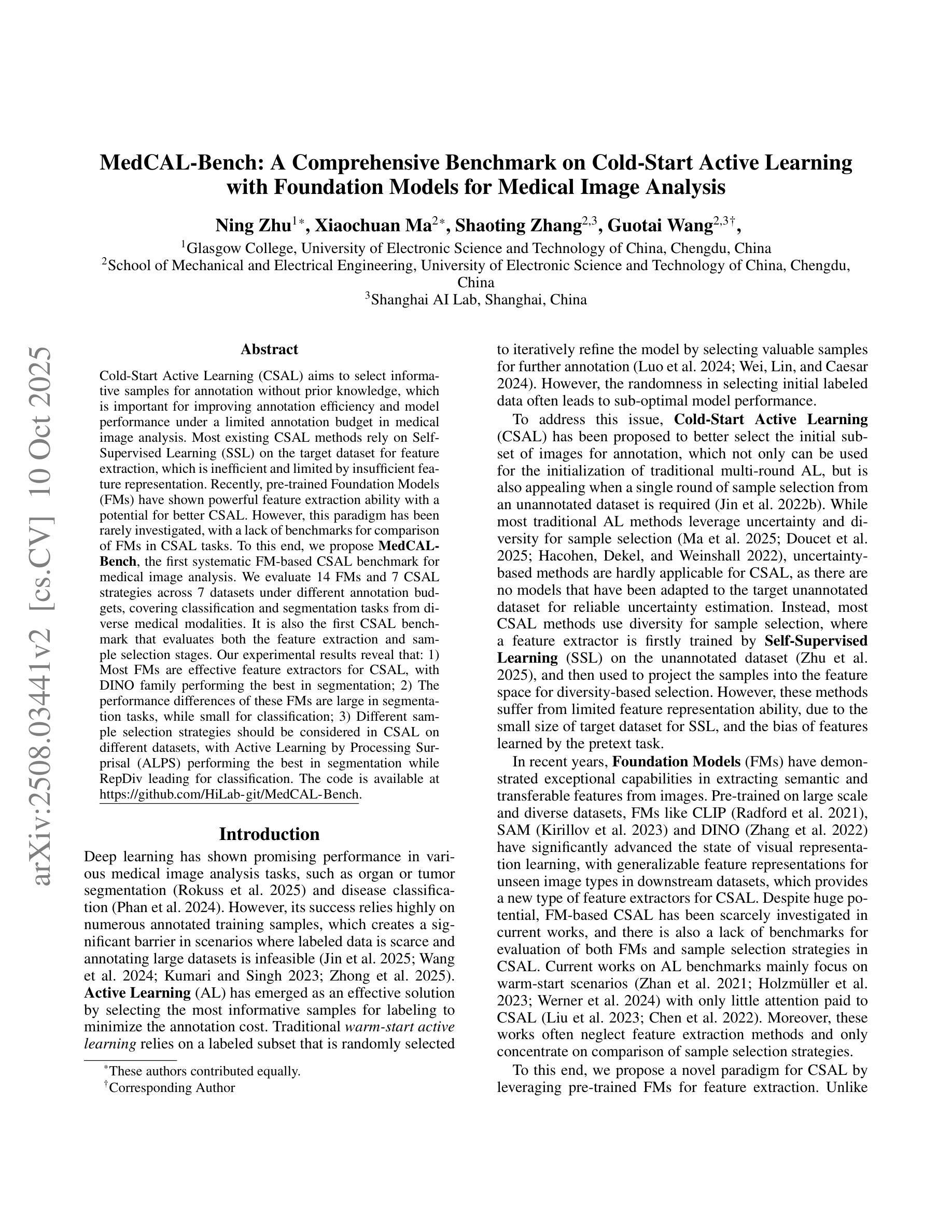 本文介绍了针对医学图像分析中的冷启动主动学习方法(CSAL)的挑战,强调了在无先验知识的情况下选择信息样本的重要性。文章指出传统CSAL方法依赖目标数据集的自我监督学习(SSL)进行特征提取存在效率低下和特征表示不足的问题。为解决这个问题,研究引入了预训练的Foundation Models(FMs),展现了强大的特征提取能力,并在CSAL中具有潜力。然而,FMs在CSAL中的应用鲜有研究,缺乏相应的基准测试平台。因此,本文提出了MedCAL-Bench,首个基于FM的CSAL基准测试平台,用于医学图像分析。通过评估14个FMs和7种CSAL策略在不同数据集和不同标注预算下的表现,实验结果显示不同FMs在分割任务上的性能差异较大,而在分类任务上差异较小;不同数据集的CSAL应考虑不同的样本选择策略。