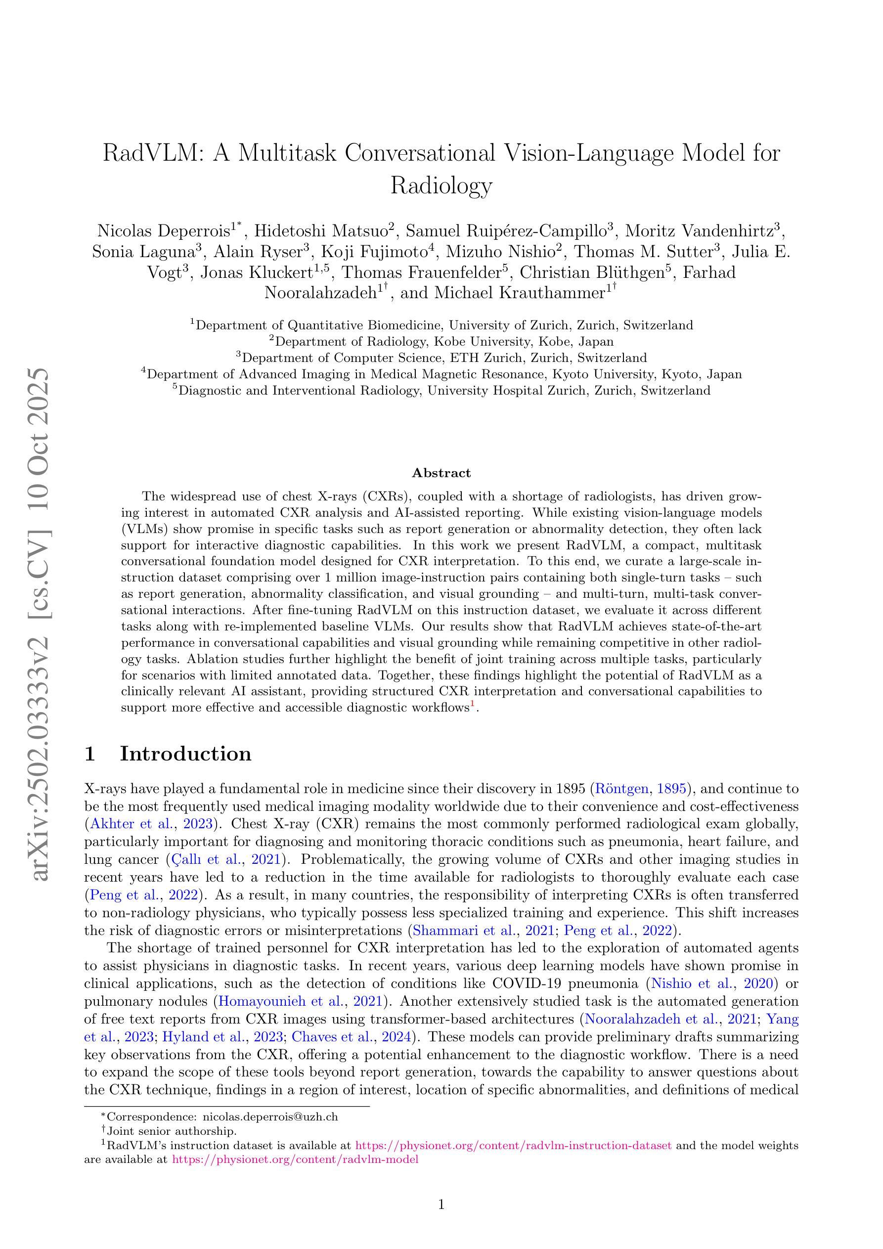 The widespread use of chest X-rays (CXRs), coupled with a shortage of radiologists, has driven growing interest in automated CXR analysis and AI-assisted reporting. While existing vision-language models (VLMs) show promise in specific tasks such as report generation or abnormality detection, they often lack support for interactive diagnostic capabilities. In this work we present RadVLM, a compact, multitask conversational foundation model designed for CXR interpretation. To this end, we curate a large-scale instruction dataset comprising over 1 million image-instruction pairs containing both single-turn tasks – such as report generation, abnormality classification, and visual grounding – and multi-turn, multi-task conversational interactions. After fine-tuning RadVLM on this instruction dataset, we evaluate it across different tasks along with re-implemented baseline VLMs. Our results show that RadVLM achieves state-of-the-art performance in conversational capabilities and visual grounding while remaining competitive in other radiology tasks. Ablation studies further highlight the benefit of joint training across multiple tasks, particularly for scenarios with limited annotated data. Together, these findings highlight the potential of RadVLM as a clinically relevant AI assistant, providing structured CXR interpretation and conversational capabilities to support more effective and accessible diagnostic workflows.