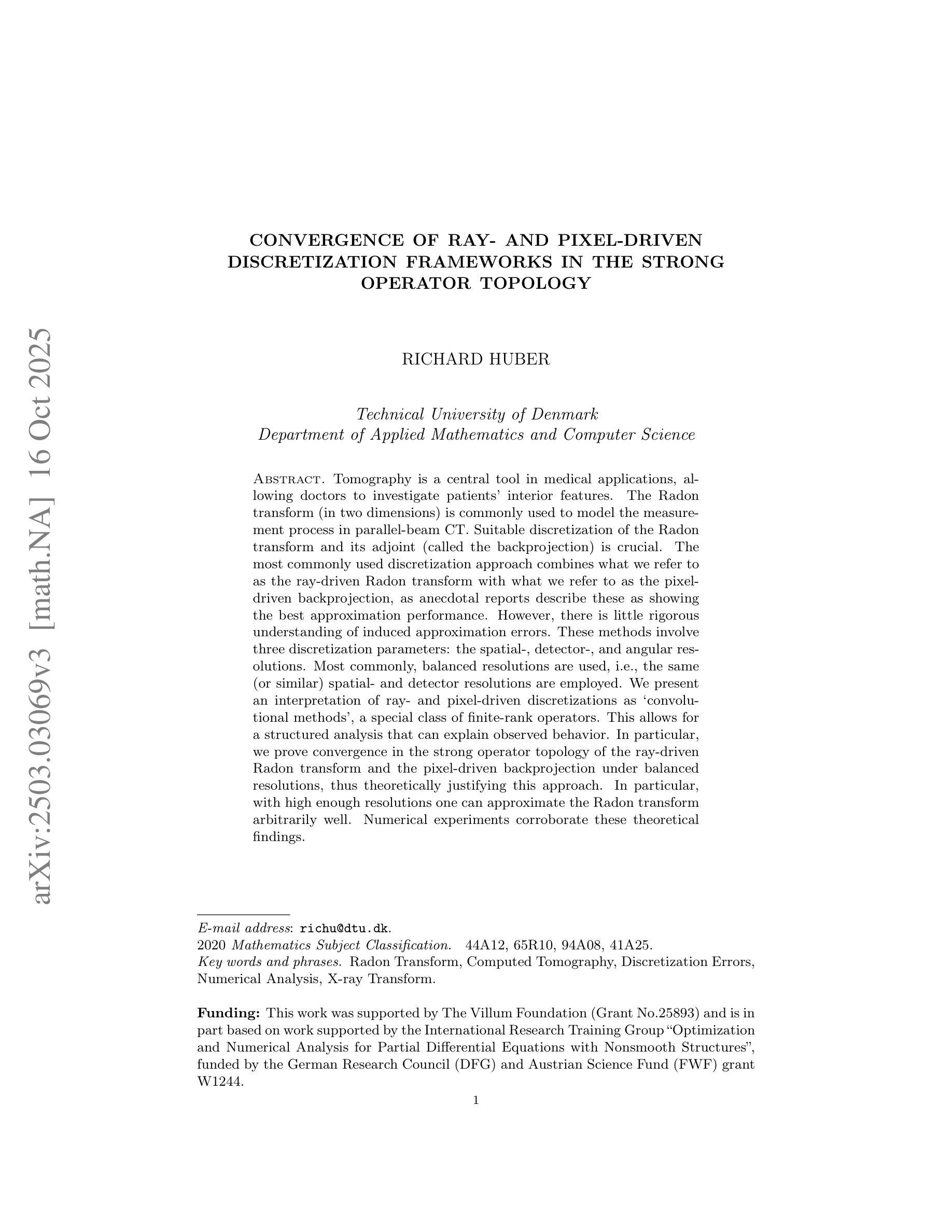 断层扫描是医学应用中的核心工具,允许医生检查患者的内部结构。Radon变换(二维)常用于平行束CT的测量过程建模。Radon变换及其伴随(称为反向投影)的适当离散化至关重要。最常用的离散化方法结合了所谓的射线驱动Radon变换和所谓的像素驱动反向投影,如个别报告所述,这些方法表现出最佳的近似性能。然而,对诱导的近似误差的严格理解很少。这些方法涉及三个离散化参数:空间分辨率、检测器分辨率和角度分辨率。通常使用的是平衡分辨率,即采用相同(或相似)的空间分辨率和检测器分辨率。我们将射线驱动和像素驱动的离散化解释为“卷积方法”,这是一类特殊的有限秩算子。这允许进行有结构的分析,可以解释观察到的行为。特别是,我们证明了在平衡分辨率下,射线驱动的Radon变换和像素驱动的反向投影在强算子拓扑中是收敛的,从而为这种方法提供了理论支持。特别是,在足够高的分辨率下,可以任意好地近似Radon变换。数值实验证实了这些理论发现。