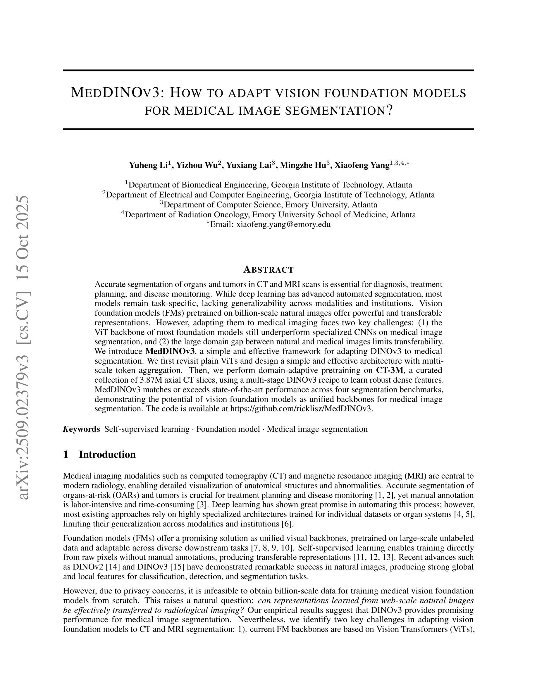 本文介绍了在CT和MRI扫描中准确分割器官和肿瘤的重要性,并指出深度学习在自动化分割方面的进展。然而,大多数模型缺乏跨模态和跨机构的通用性。文章提出将预训练于百亿级自然图像的视觉基础模型(FMs)应用于医学成像,并介绍了MedDINOv3框架,该框架通过多阶段DINOv3配方在CT-3M数据集上进行域自适应预训练,以学习稳健的密集特征。MedDINOv3在四个分割基准测试中达到了或超越了最先进的性能,展示了视觉基础模型作为医学图像分割统一主干模型的潜力。