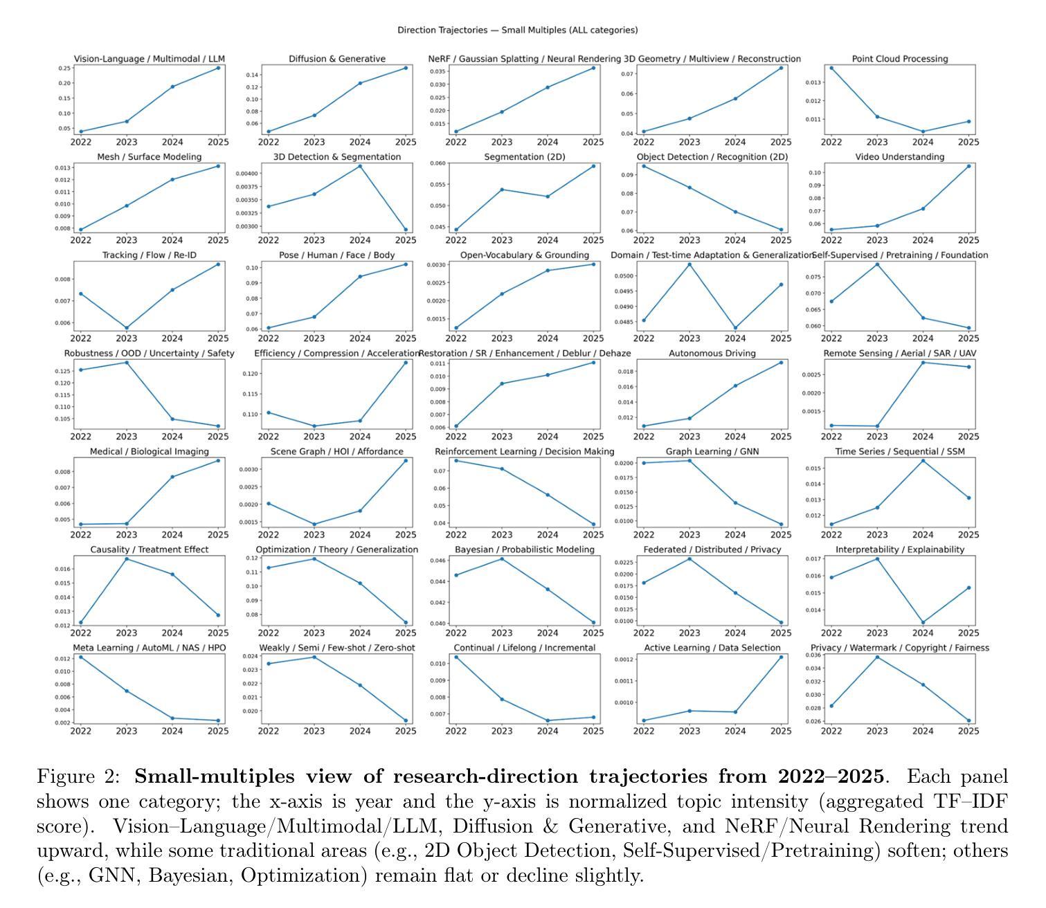 - 通过分析CVPR、ICLR和NeurIPS会议论文,覆盖2023-2025年的研究趋势变得透明和可复现。