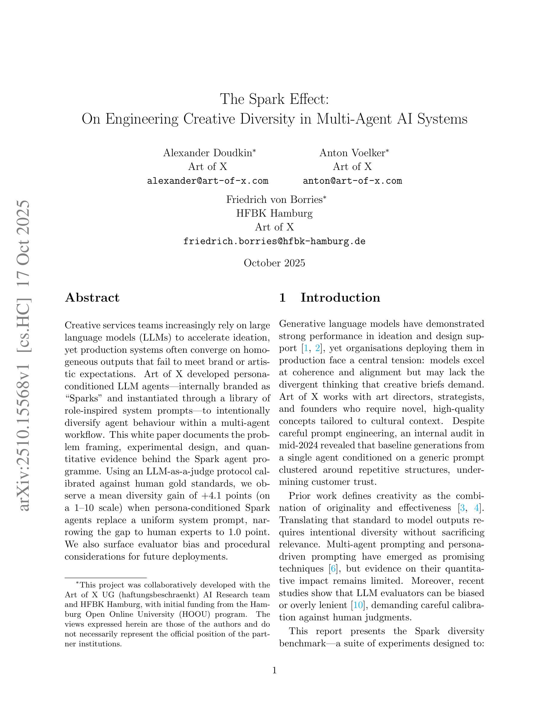 大型语言模型(LLMs)在创意服务团队中广泛应用于加速创意产生,但生产系统往往产生趋同的输出,无法满足品牌或艺术要求。为解决这一问题,Art of X开发了基于个性化设定的LLM代理——“Spark”,并通过角色启发系统提示库实现多代理工作流程内的代理行为多样化。本白皮书记录了Spark代理计划的问题框架、实验设计和定量证据。通过采用LLM作为法官的协议并对照人类黄金标准,观察到当个性化设定的Spark代理替换统一系统提示时,平均多样性增加了4.1分(在1-10的范围内),与人类专家的差距缩小到1点。同时,本文还探讨了评估者的偏见和未来部署的程序性考量。