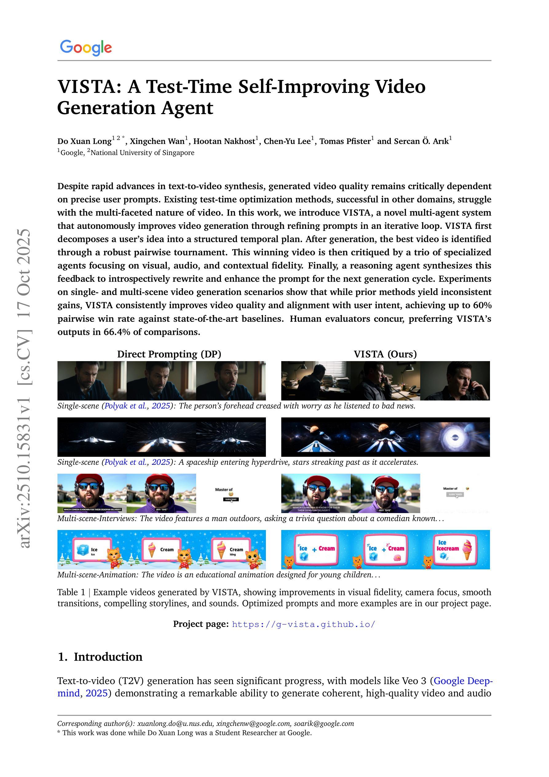 尽管文本到视频的合成技术发展迅速,生成的视频质量仍然严重依赖于精确的用户提示。其他领域成功的现有测试时间优化方法,在应对视频的多元化特性时却表现挣扎。在这项工作中,我们引入了VISTA(视频迭代自改进代理)这一新型多代理系统,该系统通过迭代循环中的提示细化来自主改进视频生成。VISTA首先会将用户的思想分解成结构化的时间计划。视频生成后,通过强大的两两配对赛来确定最佳视频。然后由专注于视觉、听觉和上下文真实度的三个专业代理对该获胜视频进行评论。最后,一个推理代理会综合这些反馈来内省地重写并增强下一次生成循环的提示。在单场景和多场景视频生成场景的实验表明,虽然先前的方法收益增长不一致,但VISTA在视频质量和符合用户意图方面始终表现出改进,与最先进的基线相比,达到了高达60%的两两胜率。人类评估者也同意这一观点,在比较中更偏向于VISTA的输出占66.4%。