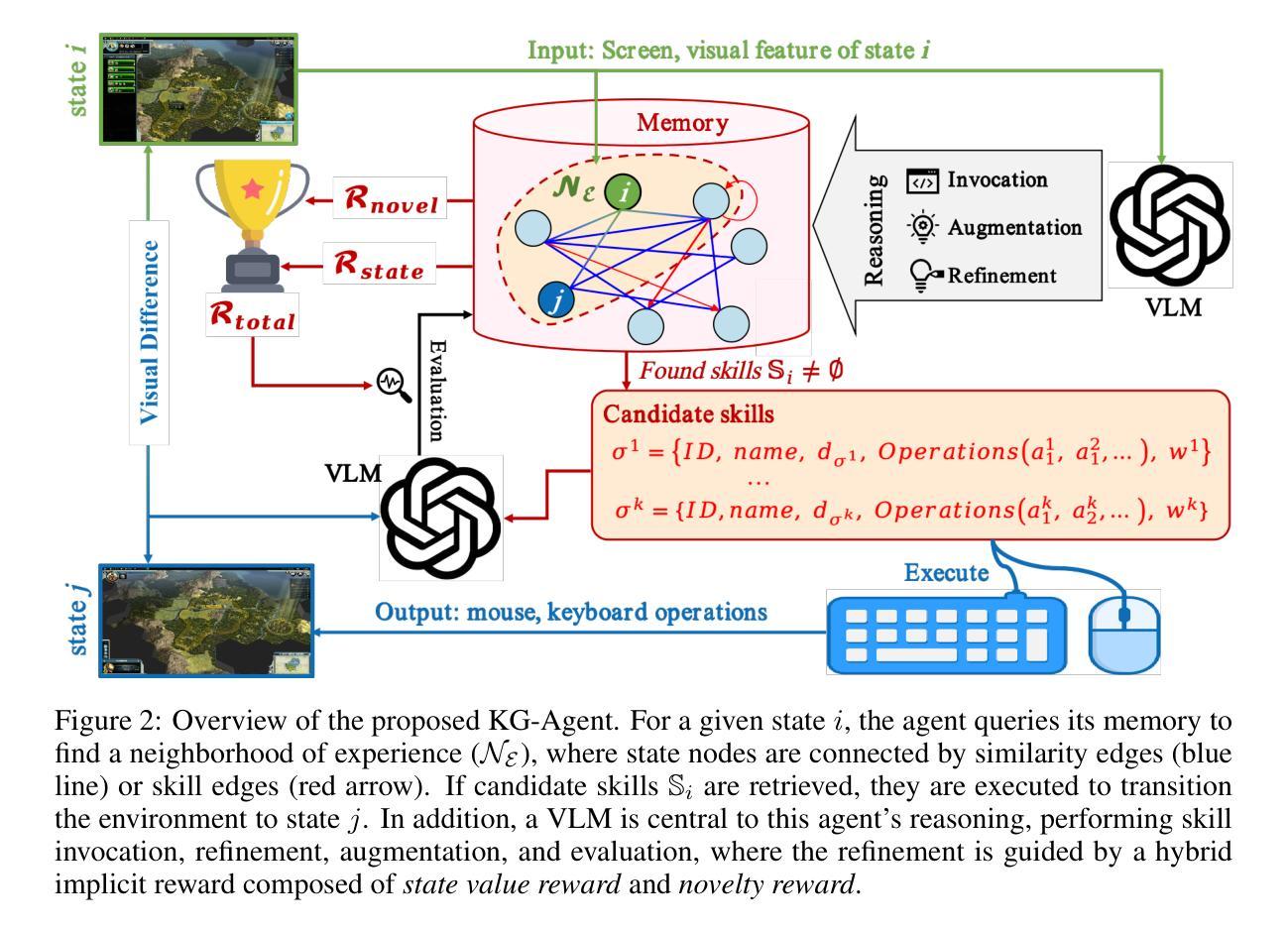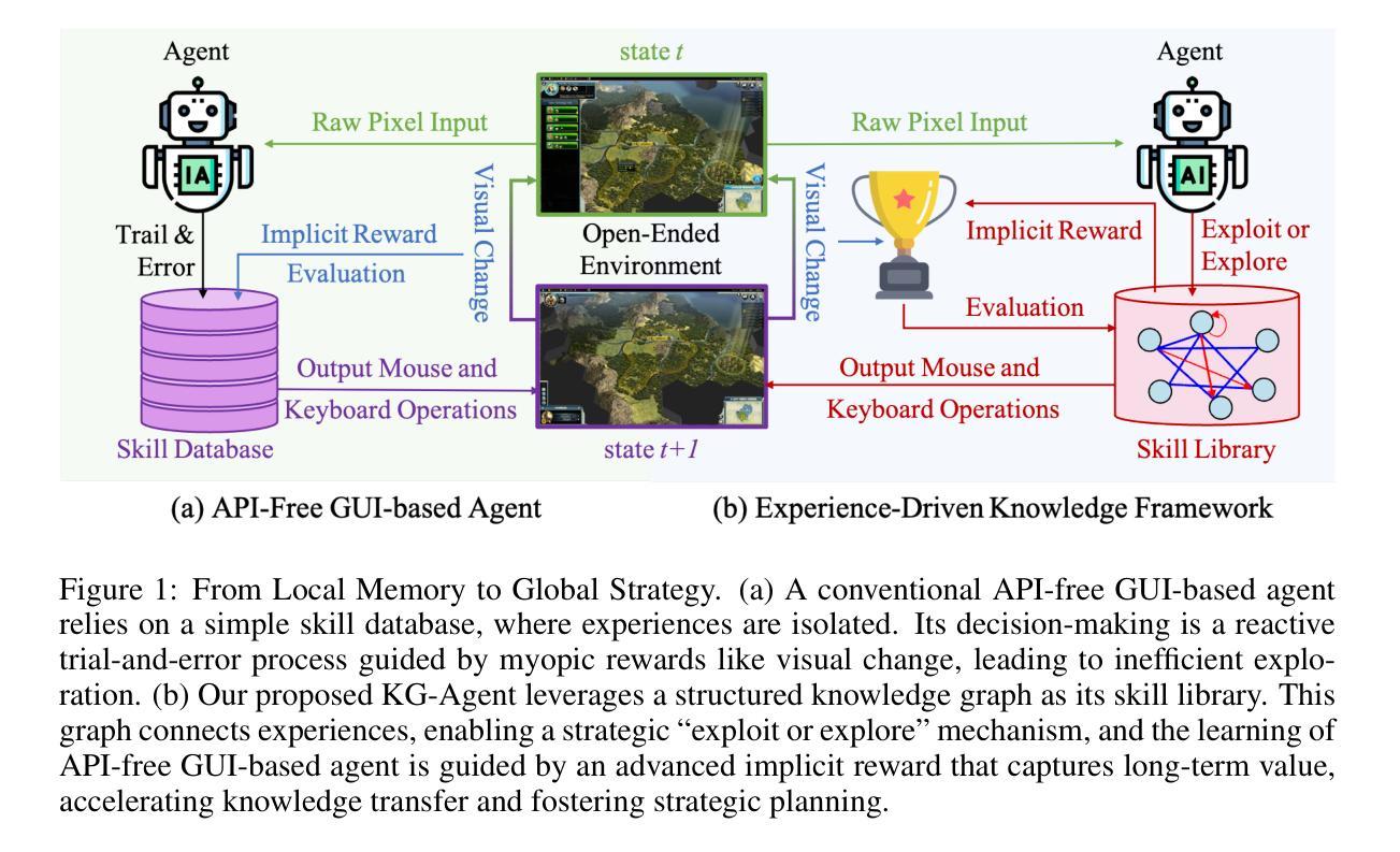 现有大多数软件缺乏可访问的应用程序编程接口(API),要求代理仅通过基于像素的图形用户界面(GUI)进行操作。在这种无API设置中,基于大型语言模型(LLM)的代理面临严重的效率瓶颈:它们仅限于本地视觉体验,做出短视的决策,并依赖低效的试错方法,这阻碍了技能获取和长期规划。为了解决这些挑战,我们提出了KG-Agent,一种经验驱动的学习框架,它将代理的原始像素级交互结构化为持久的状态-动作知识图(SA-KG)。KG-Agent通过连接功能相似但视觉不同的GUI状态,克服低效的探索,形成丰富的经验邻域,使代理能够从多种历史策略中概括。为了支持长期推理,我们设计了一种基于图形拓扑的混合内在奖励机制,结合状态价值奖励来利用已知的高价值路径与新颖性奖励来鼓励有针对性的探索。这种方法将战略规划与纯发现解耦,允许代理有效地评估设置动作的价值,并接受延迟的满足感。我们在两个复杂、开放式的基于GUI的决策环境(文明V和屠杀魔塔)中对KG-Agent进行了评估,结果表明,与最新方法相比,它在探索效率和战略深度方面都有显著提高。