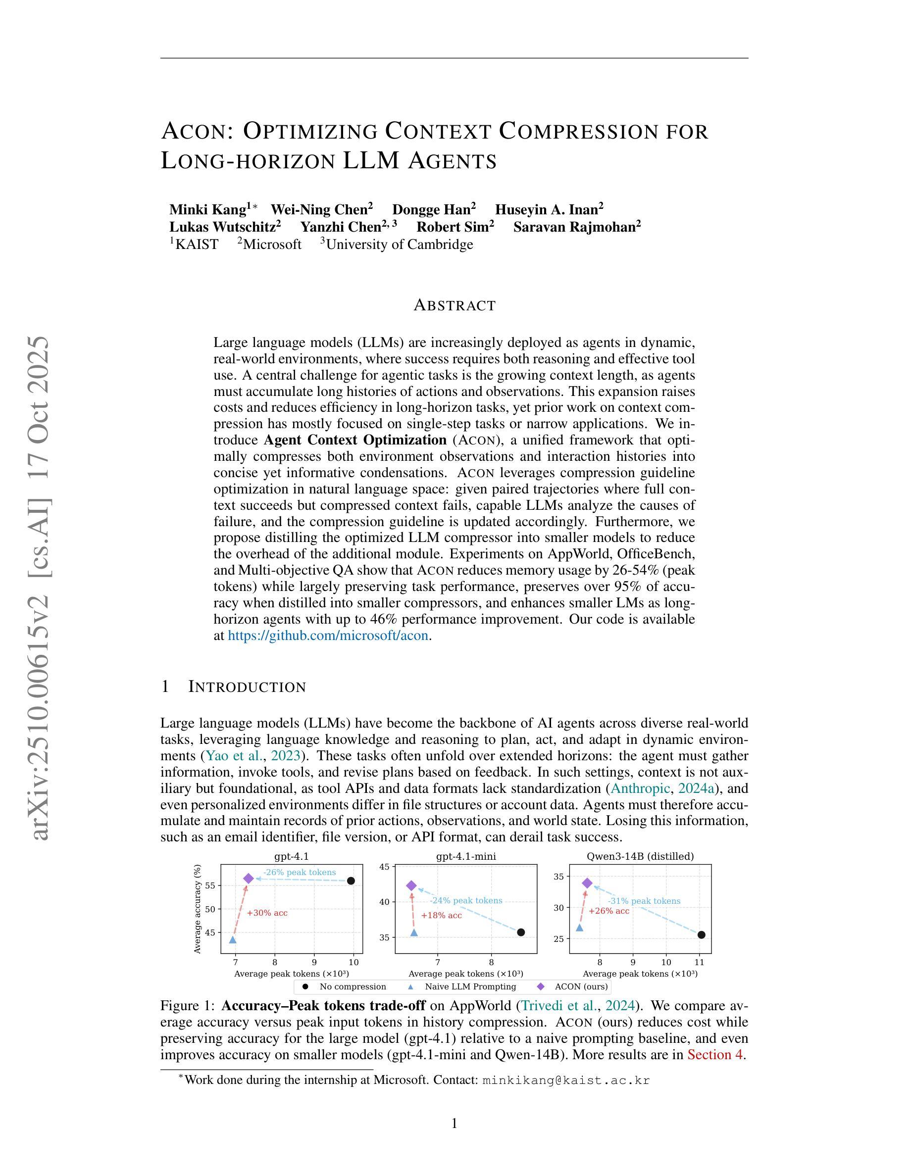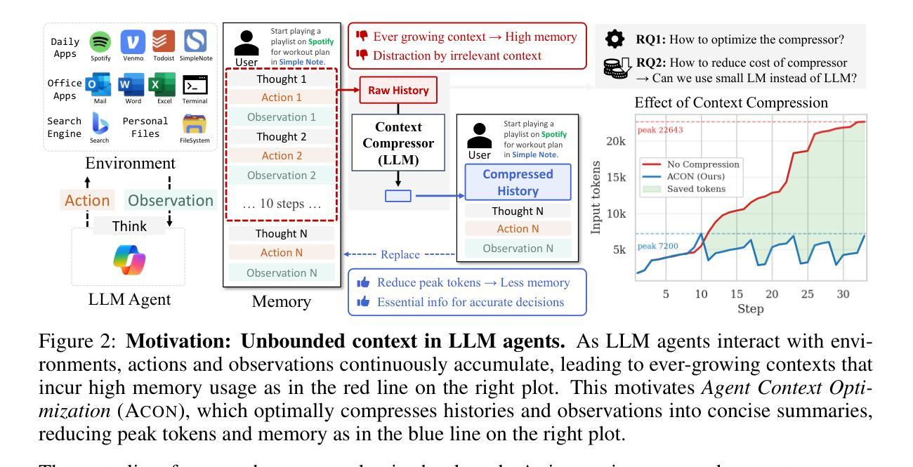大型语言模型(LLM)作为智能体,在动态、现实世界的环境中得到了越来越广泛的应用,在这些环境中,成功既需要推理能力也需要有效的工具使用能力。智能体任务的一个核心挑战是上下文长度的不断增长,因为智能体必须积累大量的行为和观察历史。这种扩展增加了成本并降低了长期任务的效率,而之前关于上下文压缩的研究主要集中在单步任务或狭窄的应用领域。我们引入了Agent Context Optimization(ACON)这一统一框架,它可以最优地将环境观察和交互历史压缩成简洁而信息丰富的形式。ACON利用自然语言空间中的压缩指南优化:给定完整的上下文成功但压缩的上下文失败的配对轨迹,有能力的大型语言模型会分析失败的原因,并相应地更新压缩指南。此外,我们提出将优化后的大型语言模型压缩机蒸馏到较小的模型中,以减少附加模块的开销。在AppWorld、OfficeBench和多目标问答上的实验表明,ACON在内存使用方面减少了26-54%(峰值令牌),同时基本保持了任务性能;在蒸馏到较小的压缩机后,准确率保留了超过95%;并能在长期任务中增强较小的语言模型性能,最高提升46%。我们的代码可在https://github.com/microsoft/acon找到。