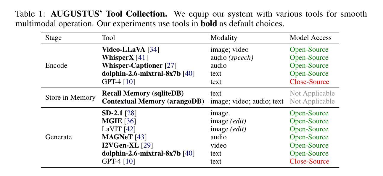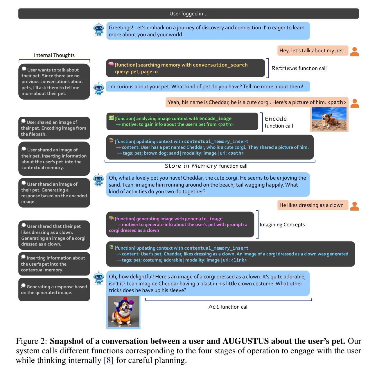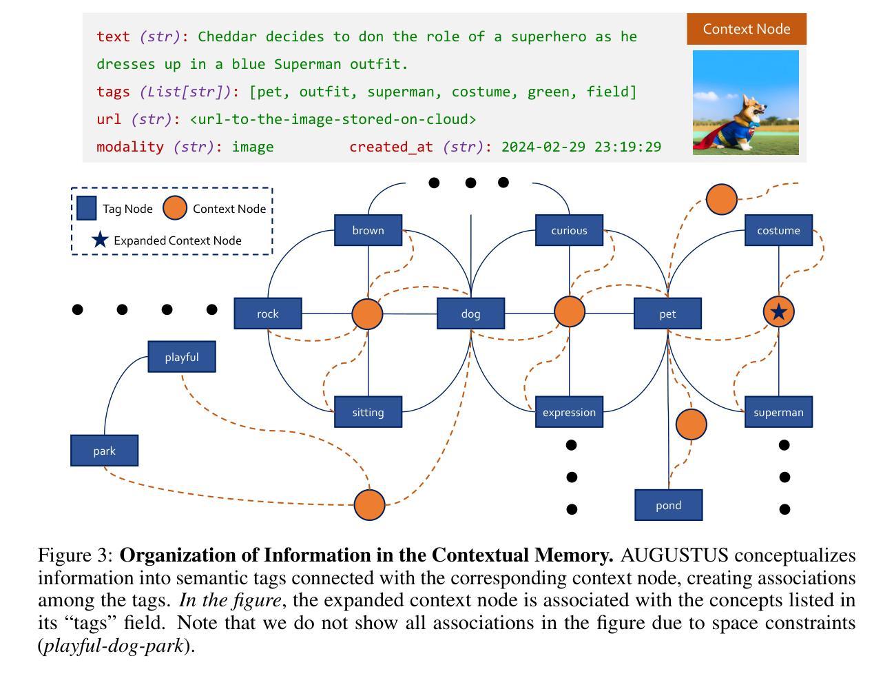 4.AUGUSTUS系统包括编码、存储、检索和行动四个关键阶段。 - 该系统采用概念化信息为语义标签,并将其与上下文关联存储在图形结构的多模态上下文记忆中。