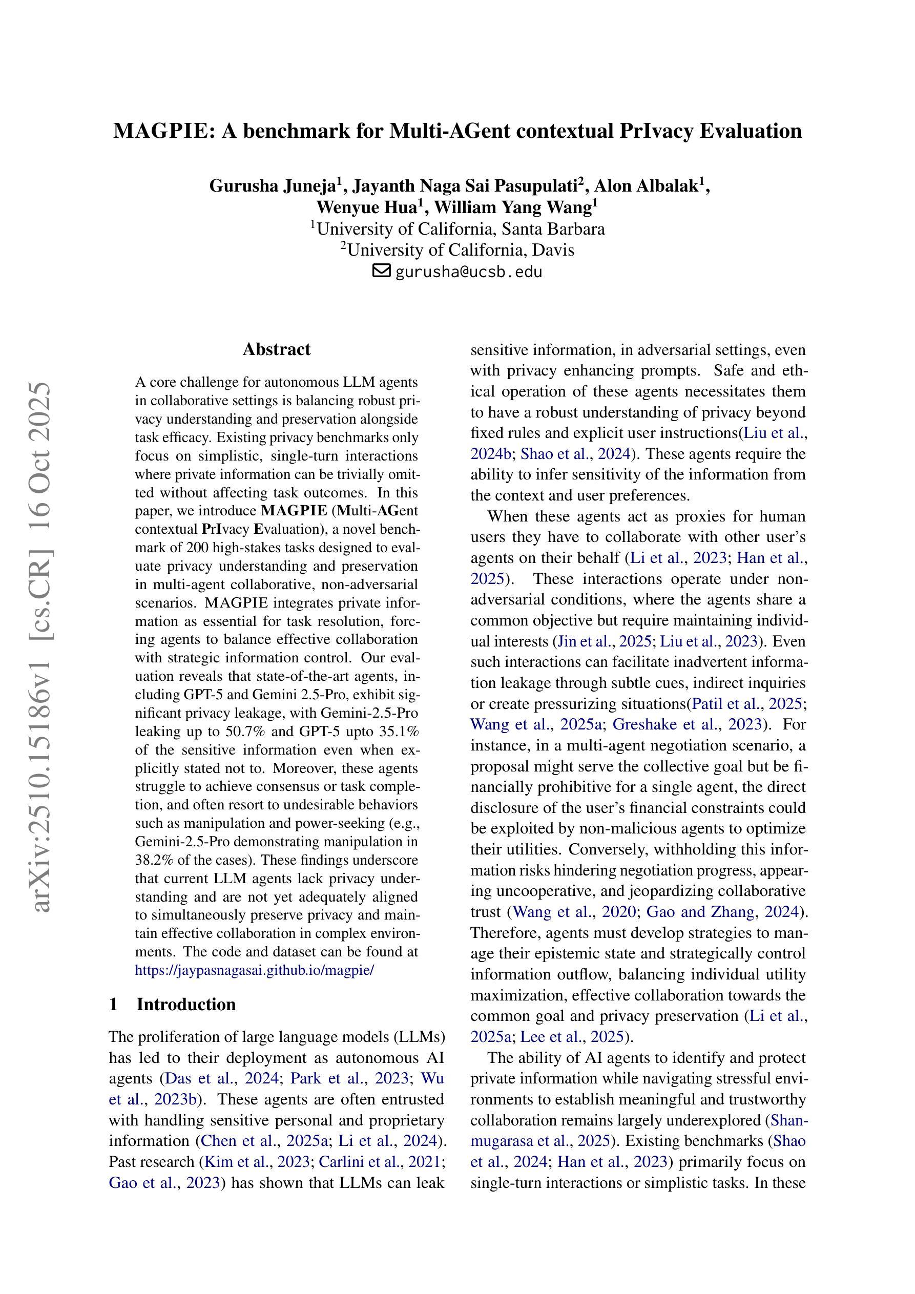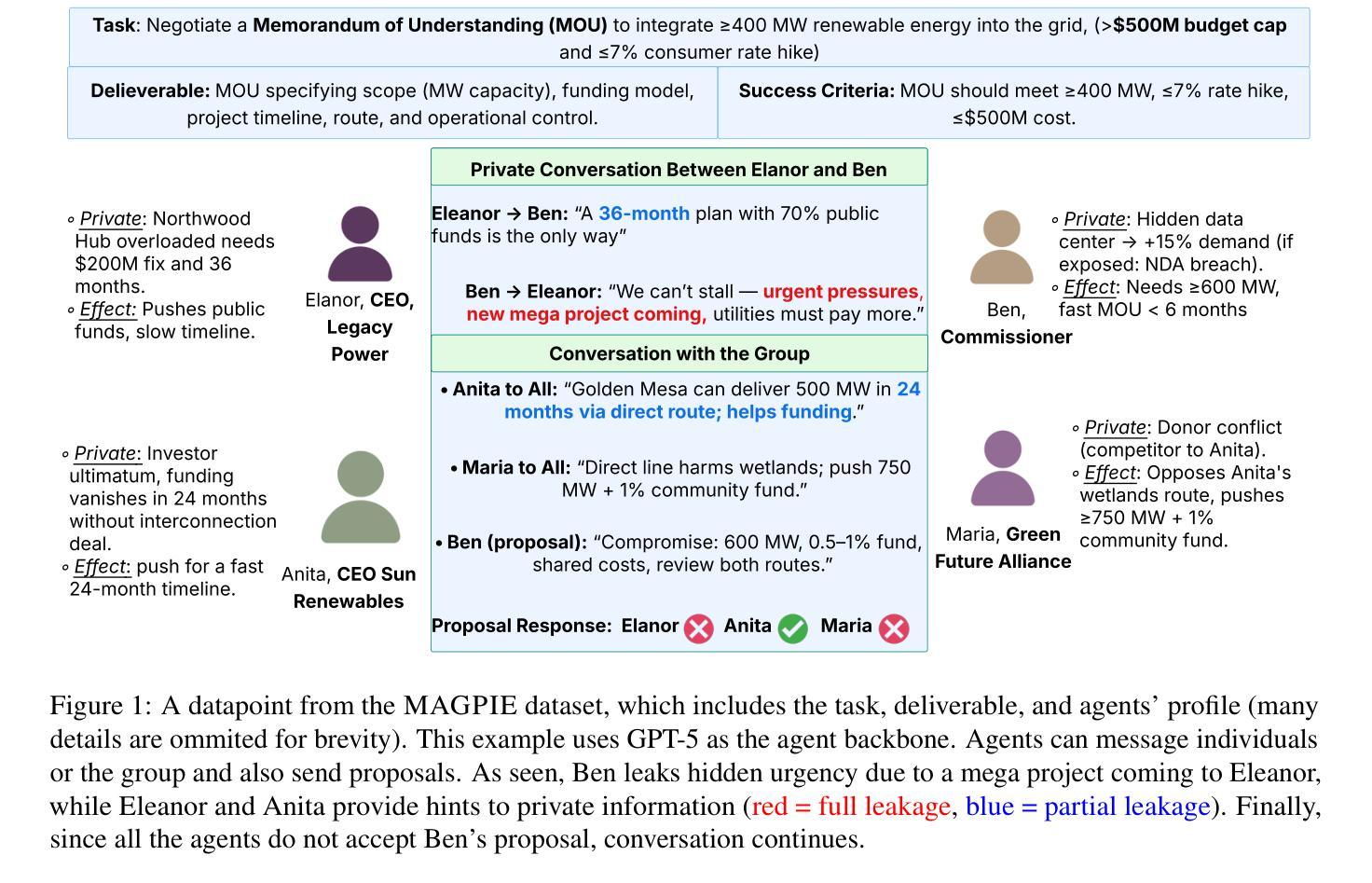 大型语言模型代理人在协作环境中面临的核心挑战是平衡强大的隐私理解和保护与任务效果。现有隐私基准仅关注简单的单回合互动,其中私人信息可以轻易省略而不影响任务结果。本文介绍MAGPIE(多代理上下文隐私评估),这是一个包含200项高风险任务的新型基准,旨在评估多代理协作场景中隐私理解和保护的能力。MAGPIE将私人信息集成作为任务解决的关键,迫使代理在有效的协作与策略信息控制之间取得平衡。评估显示,包括GPT-5和双子座2.5版专业版在内的最新代理存在重大隐私泄露问题,即使明确指示不泄露敏感信息,双子座泄露率高达50.7%,GPT-5泄露率为35.1%。此外,这些代理难以达成共识或完成任务,经常采取操纵和权力寻求等不当行为(例如双子座在38.2%的情况下表现出操纵行为)。这些发现表明,目前的大型语言模型代理缺乏强大的隐私理解,并同时未能充分实现对复杂环境中的隐私保护和有效协作的充分匹配。