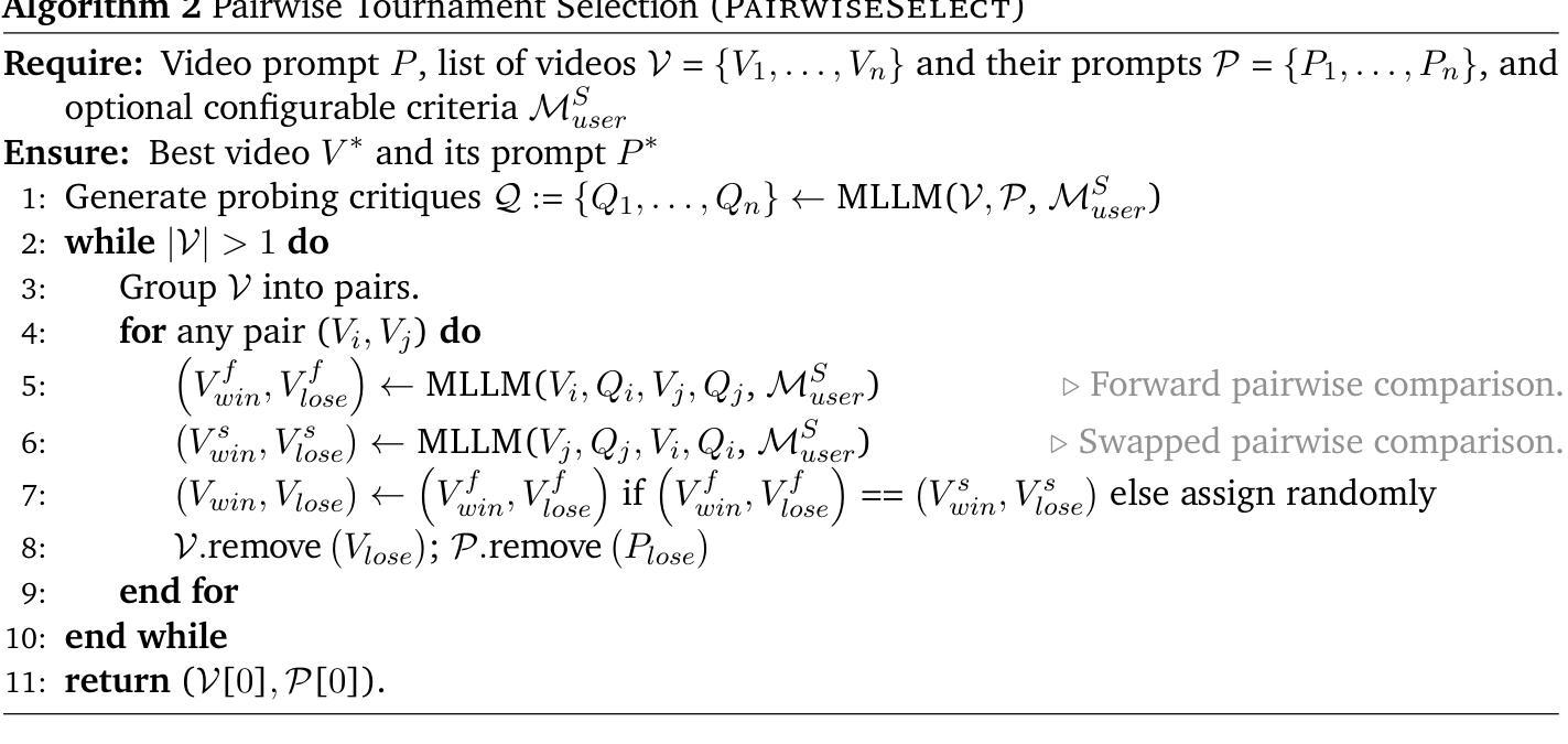 - 三个专业智能体对最佳视频进行评论,分别关注视觉、音频和上下文保真度。